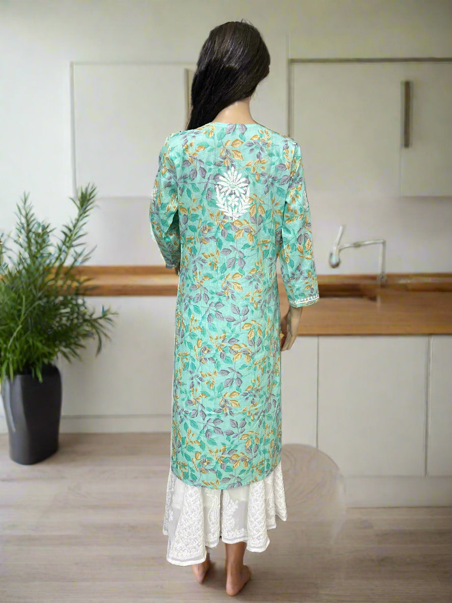 This Lucknowi Chikankari Green Printed Cotton Kurti combines traditional craftsmanship with breathable cotton fabric, ensuring comfort and elegance. The intricate chikankari embroidery highlights the rich cultural heritage of Lucknow, while the green print adds a fresh, vibrant touch. Ideal for both casual and semi-formal occasions, this kurti offers a refined look with natural comfort, making it a versatile addition to your wardrobe.