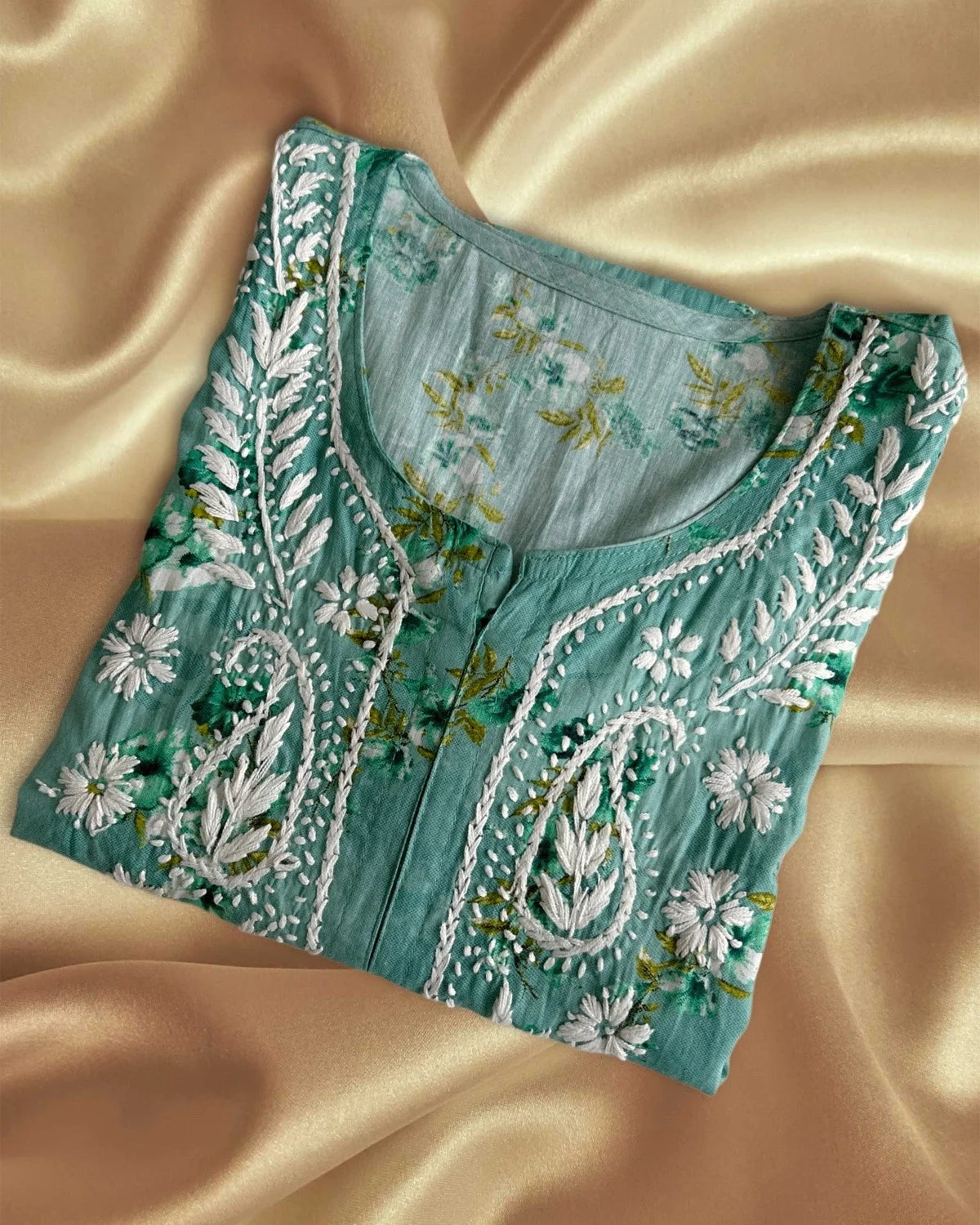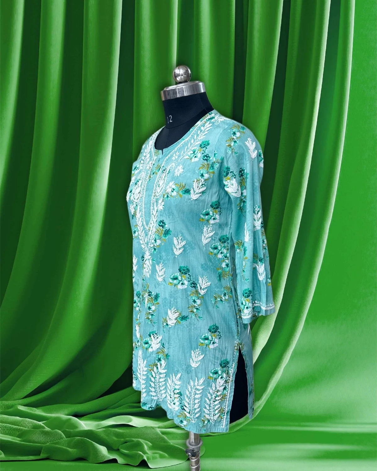 This Lucknowi Chikankari short kurti, made of soft cotton fabric, features a beautiful green print, bringing a touch of elegance to your wardrobe. Its breathable and lightweight material ensures comfort, making it perfect for both casual and formal wear. Enhance your style with this chic and versatile piece.