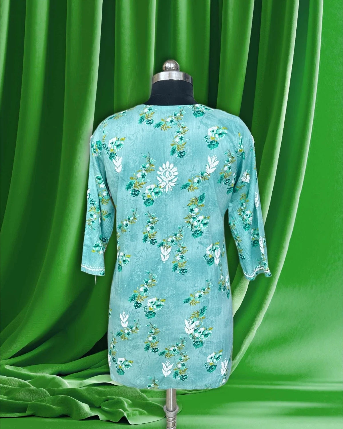 Lucknowi Chikankari Green Printed Cotton Short Kurti-T000023