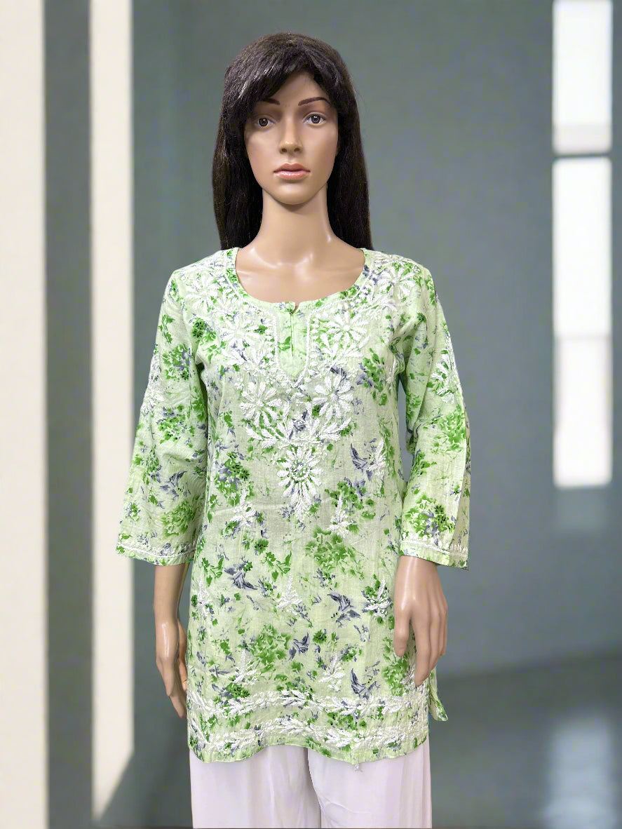 Lucknowi Chikankari Green Printed Cotton Short Kurti-T000080