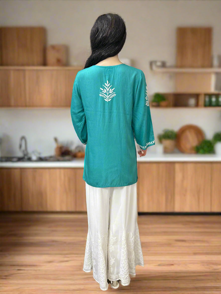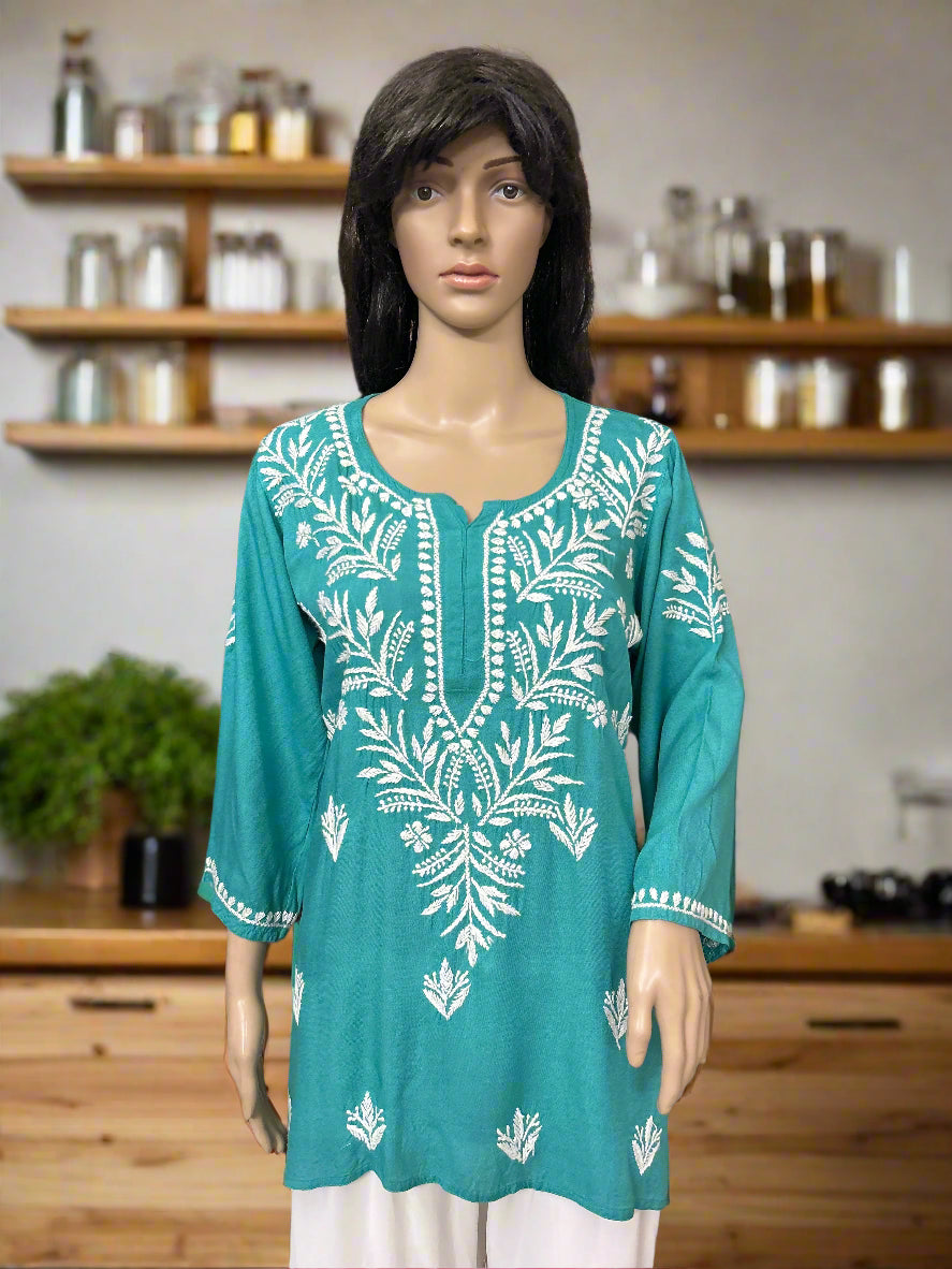 Lucknowi Chikankari Green Rayon Short Kurti-T000072