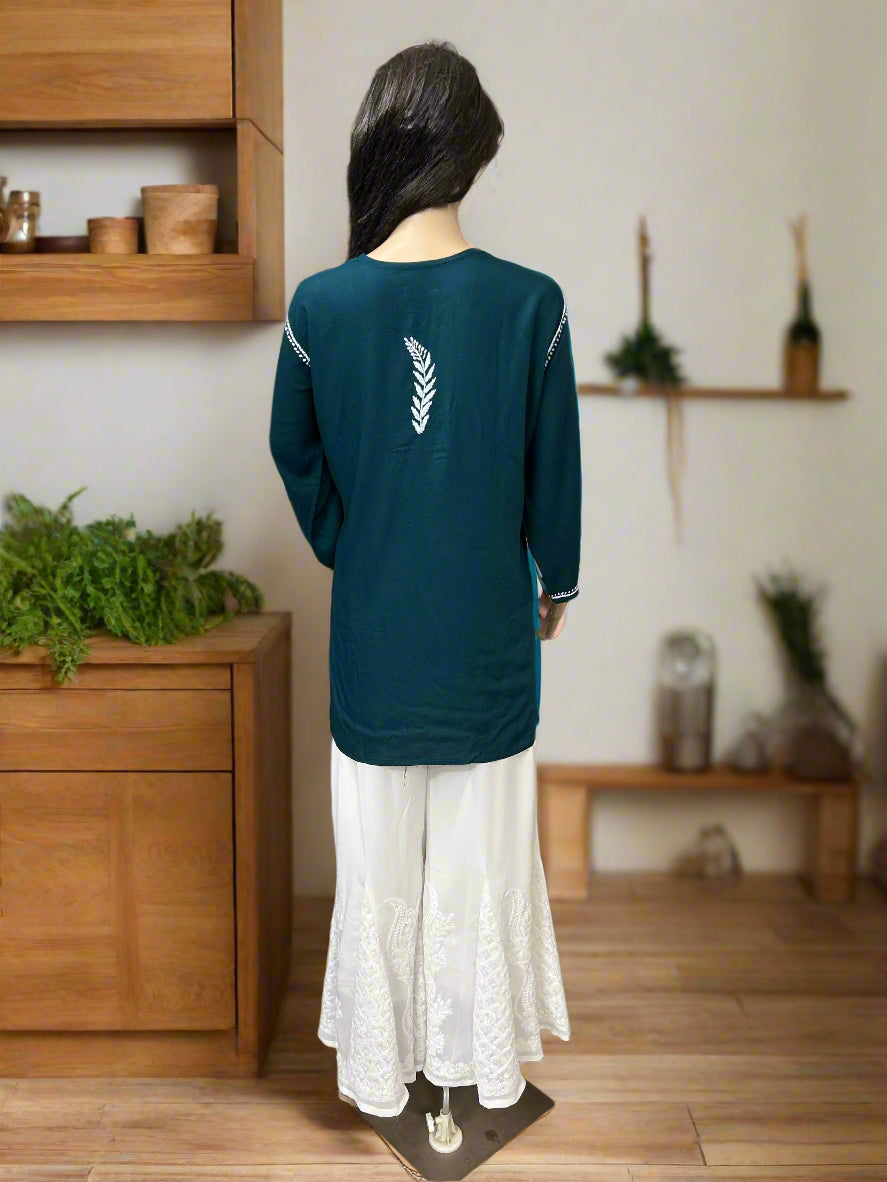 Lucknowi Chikankari Green Rayon Short Kurti-T000079