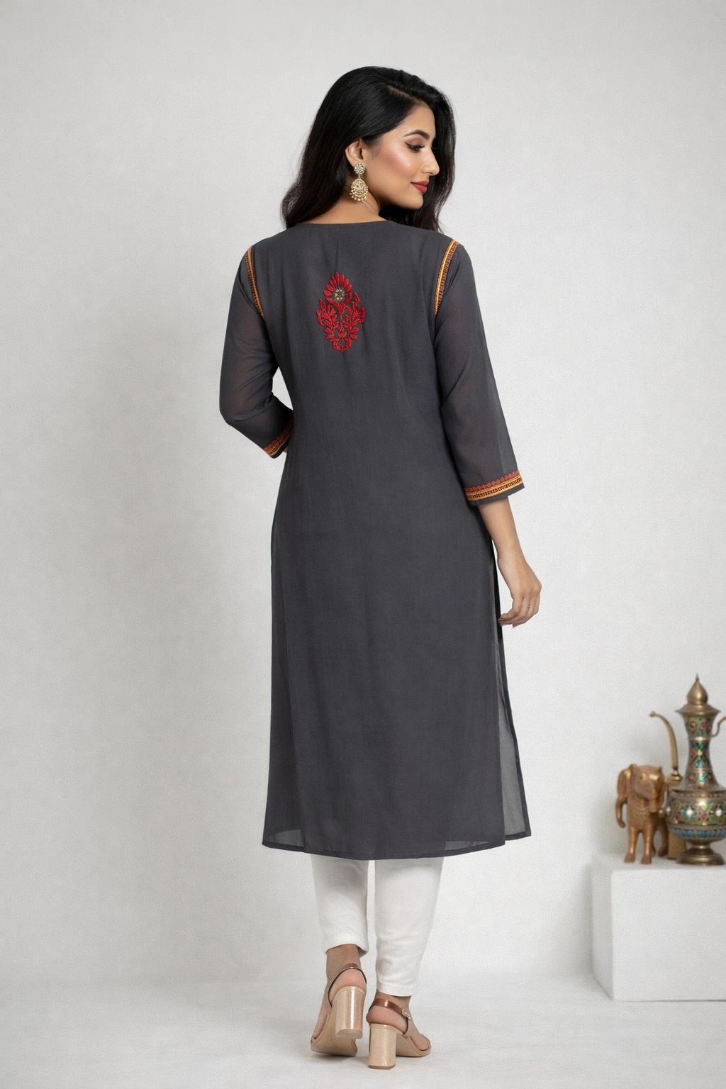 Disclaimer: This product is being processed using AI; Embroidery motifs and patterns in the image may differ from actual. Each article is uniquely hand-embroidered by artisans, and natural variations in motifs design are a hallmark of genuine work. Customers are assured of receiving an authentic handmade product, though it may not be an exact replica of visual. No rights are claimed over likeness of the model depicted in this AI-generated image.