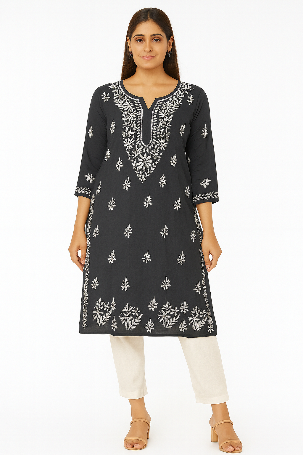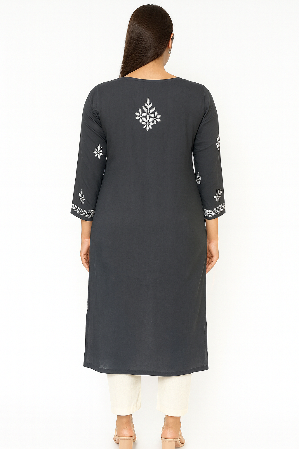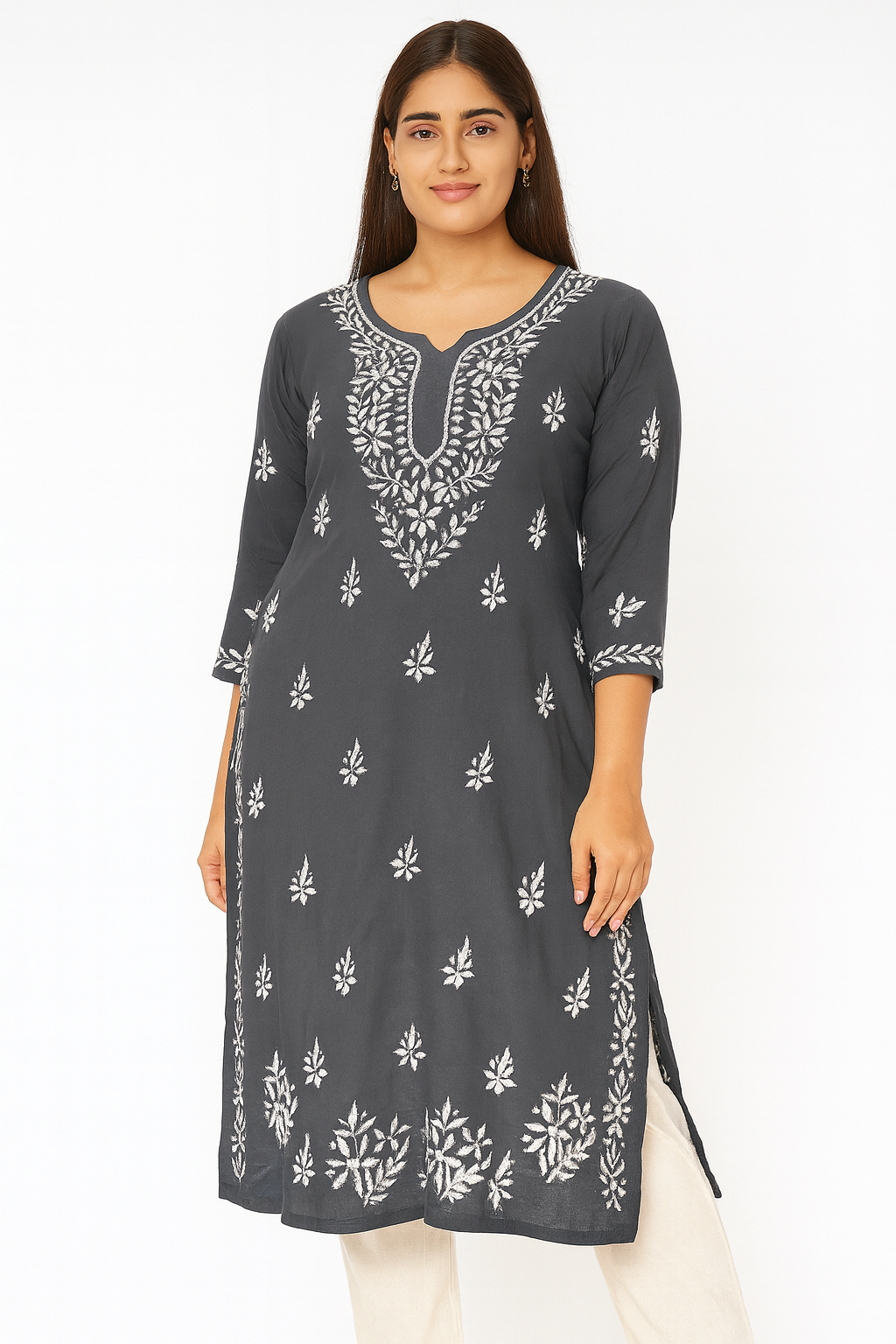 Step into timeless elegance with this charcoal grey Lucknowi Chikankari kurti, exquisitely hand-embroidered with intricate white floral motifs. The rich contrast of grey and white embroidery brings out the artistry of chikankari, making it perfect for both everyday sophistication and festive gatherings. Ivory or off-white straight pants (classic & elegant); Light grey chikankari pants for a coordinated monochrome vibe are best suggestions. Oxidised silver jhumkas or chandbalis for a traditional look gives it a complete look.