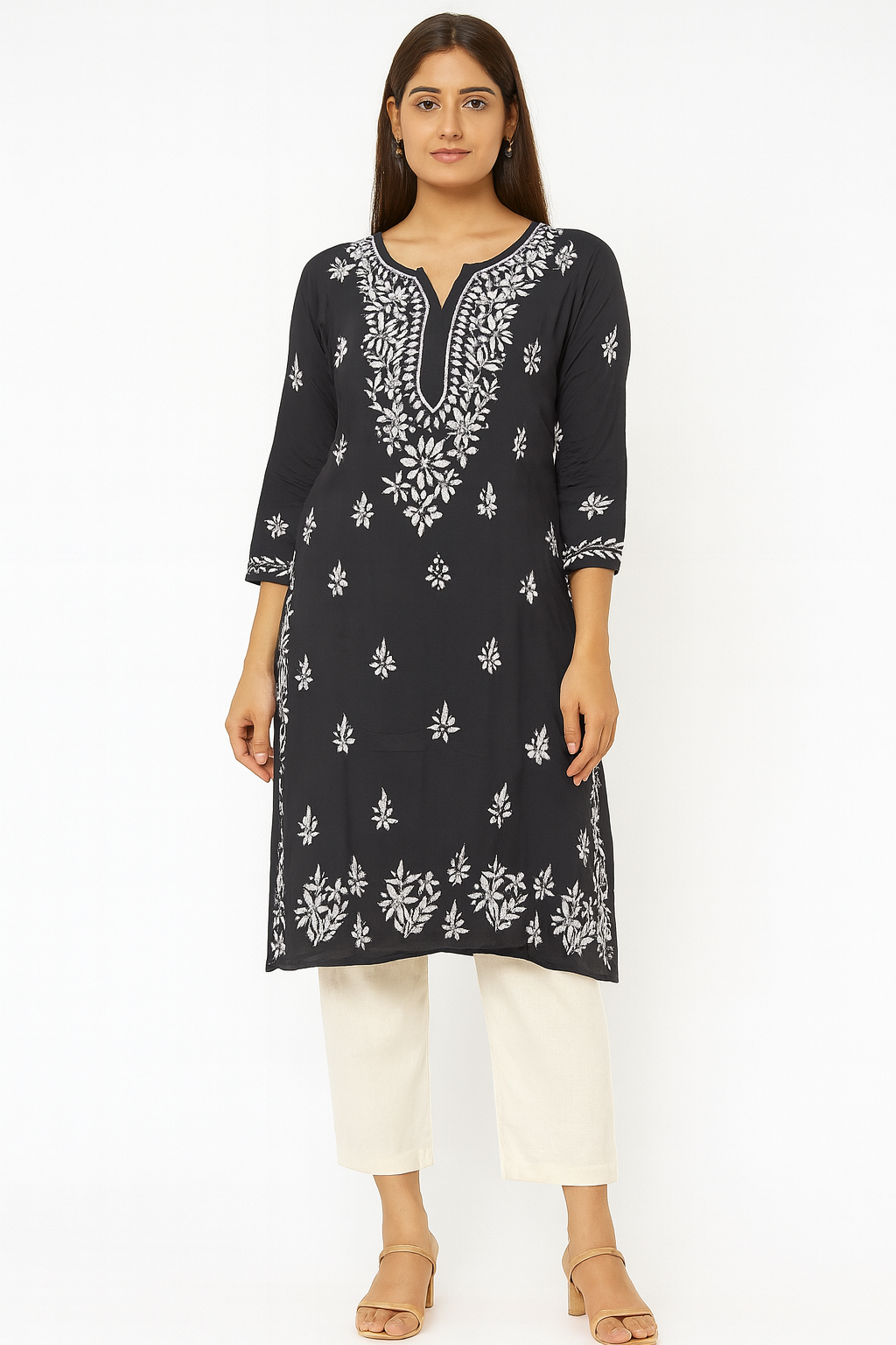 Disclaimer: This product is being processed using AI; Embroidery motifs and patterns in the image may differ from actual. Each kurti is uniquely hand-embroidered by artisans, and natural variations in motifs design are a hallmark of genuine work. Customers are assured of receiving an authentic handmade product, though it may not be an exact replica of visual. No rights are claimed over likeness of the model depicted in this AI-generated image.