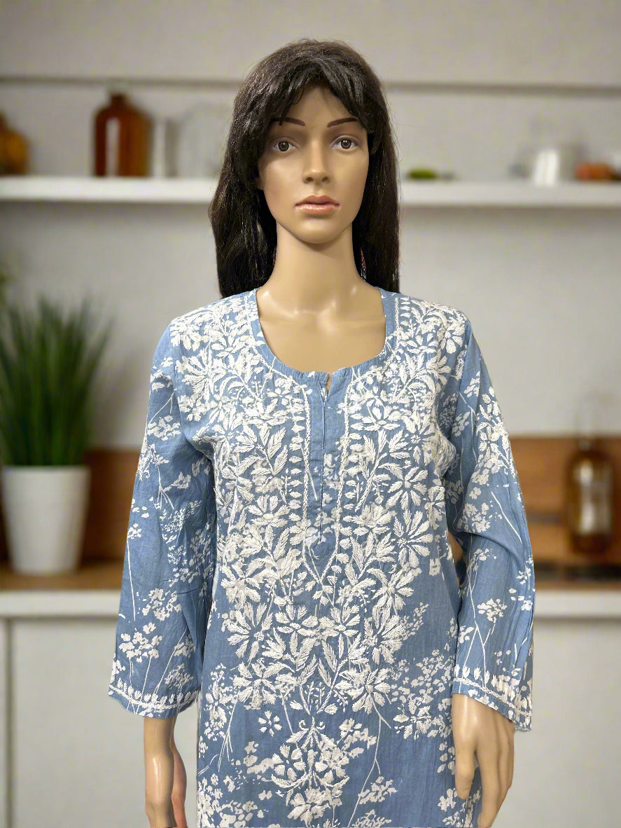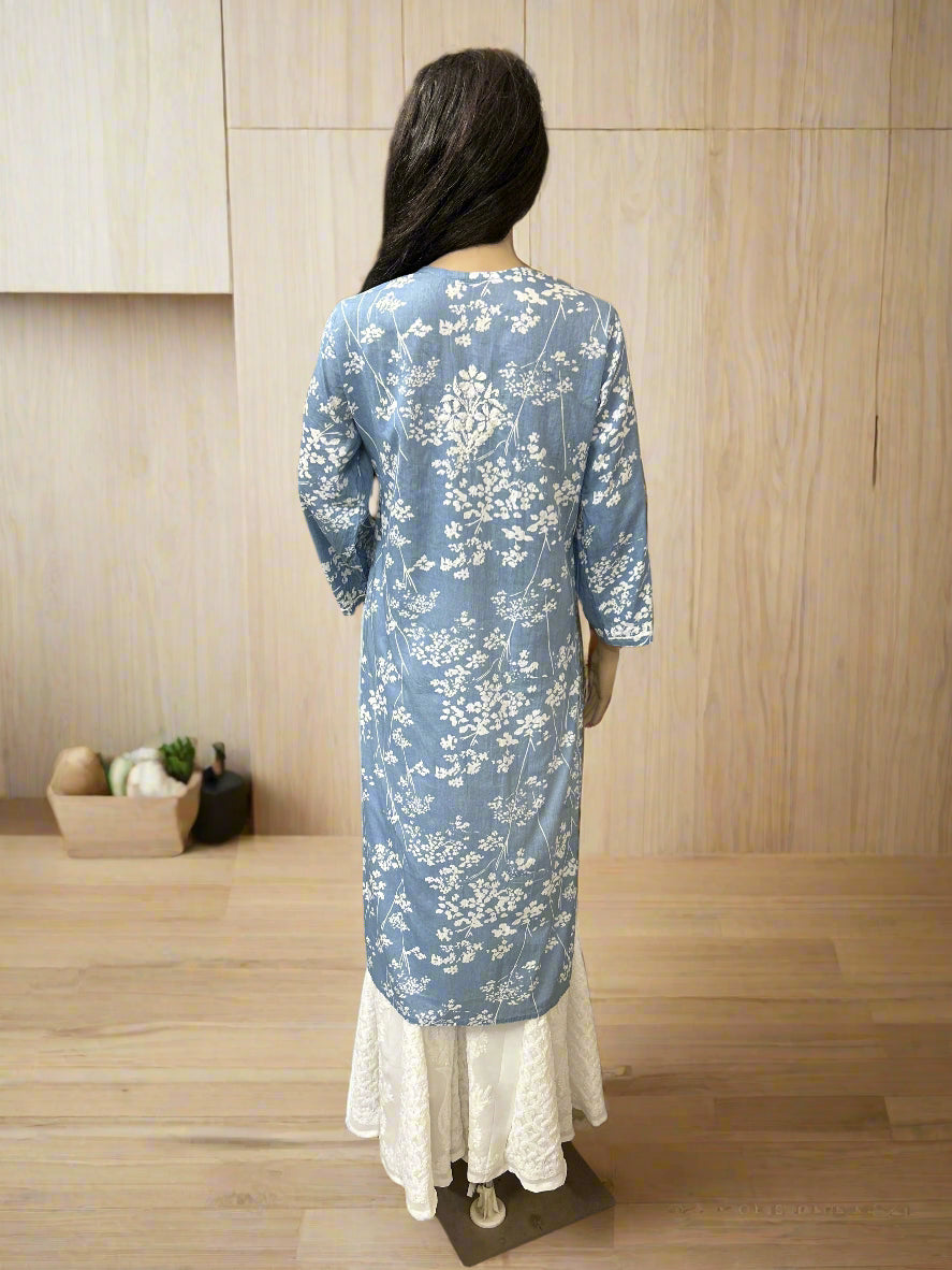 Lucknowi Chikankari Grey 'Dhoondhla' Printed Cotton Kurti-K40093