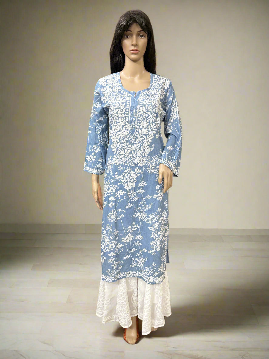 This Lucknowi Chikankari Grey Printed Cotton Kurti combines traditional craftsmanship with breathable cotton fabric, ensuring comfort and elegance. The intricate chikankari embroidery highlights artisanal skill, making it suitable for both casual and semi-formal occasions. Its grey tone offers versatile styling options, while the lightweight cotton keeps you cool throughout the day. Ideal for those who appreciate heritage textiles with contemporary wearability.