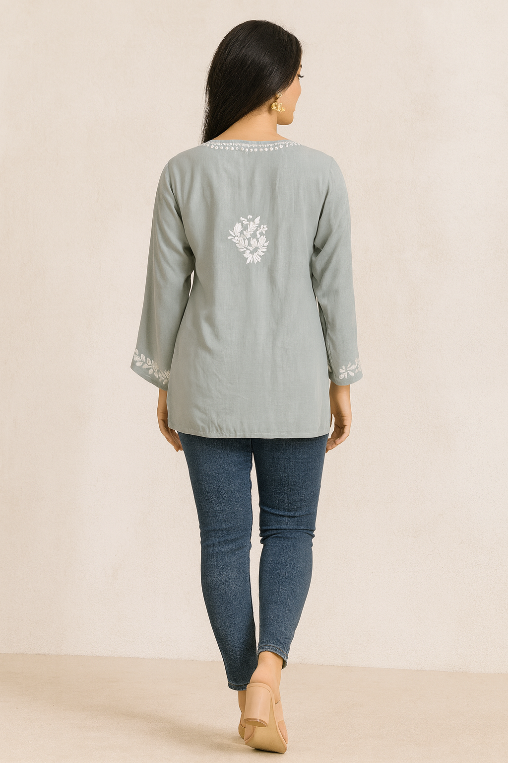 Rooted in the timeless elegance of Lucknow, the city of Nawabs, this Lucknowi Chikankari short kurti cum top beautifully blends traditional craftsmanship with modern styling. Crafted to suit women of all age groups, it is a versatile piece that effortlessly elevates everyday and semi-occasion wear. Looks exceptionally classy when paired with denim jeans.
