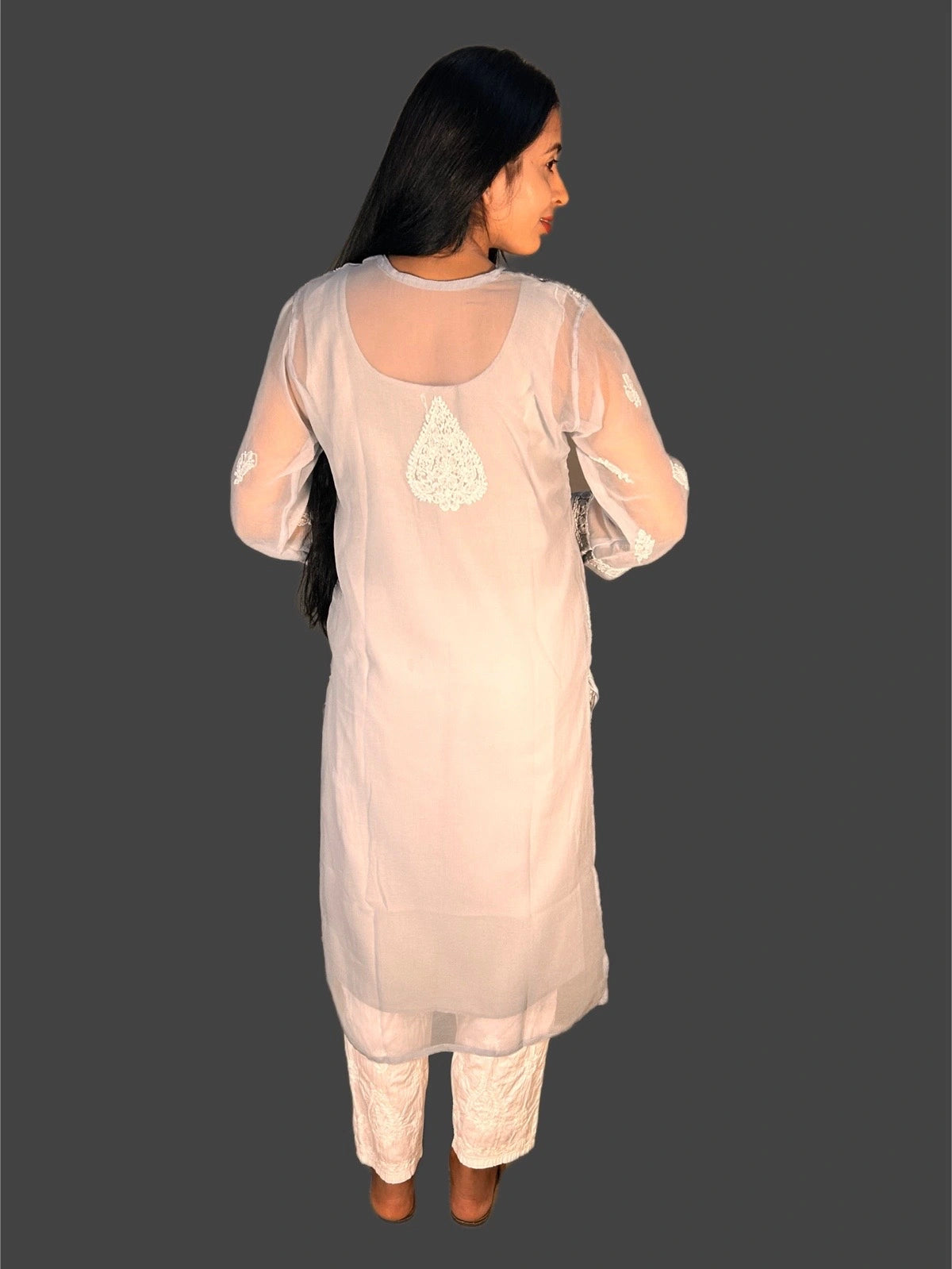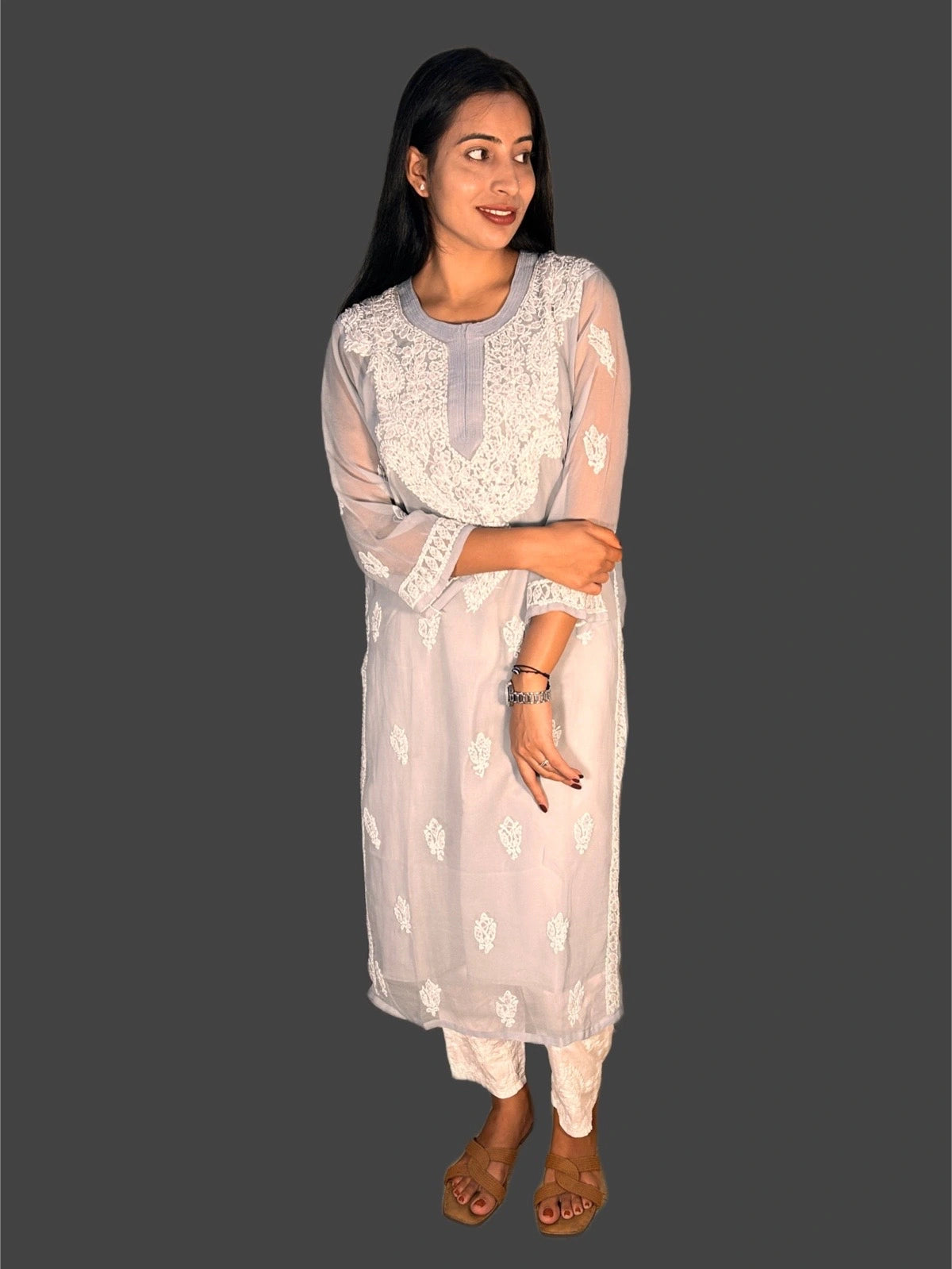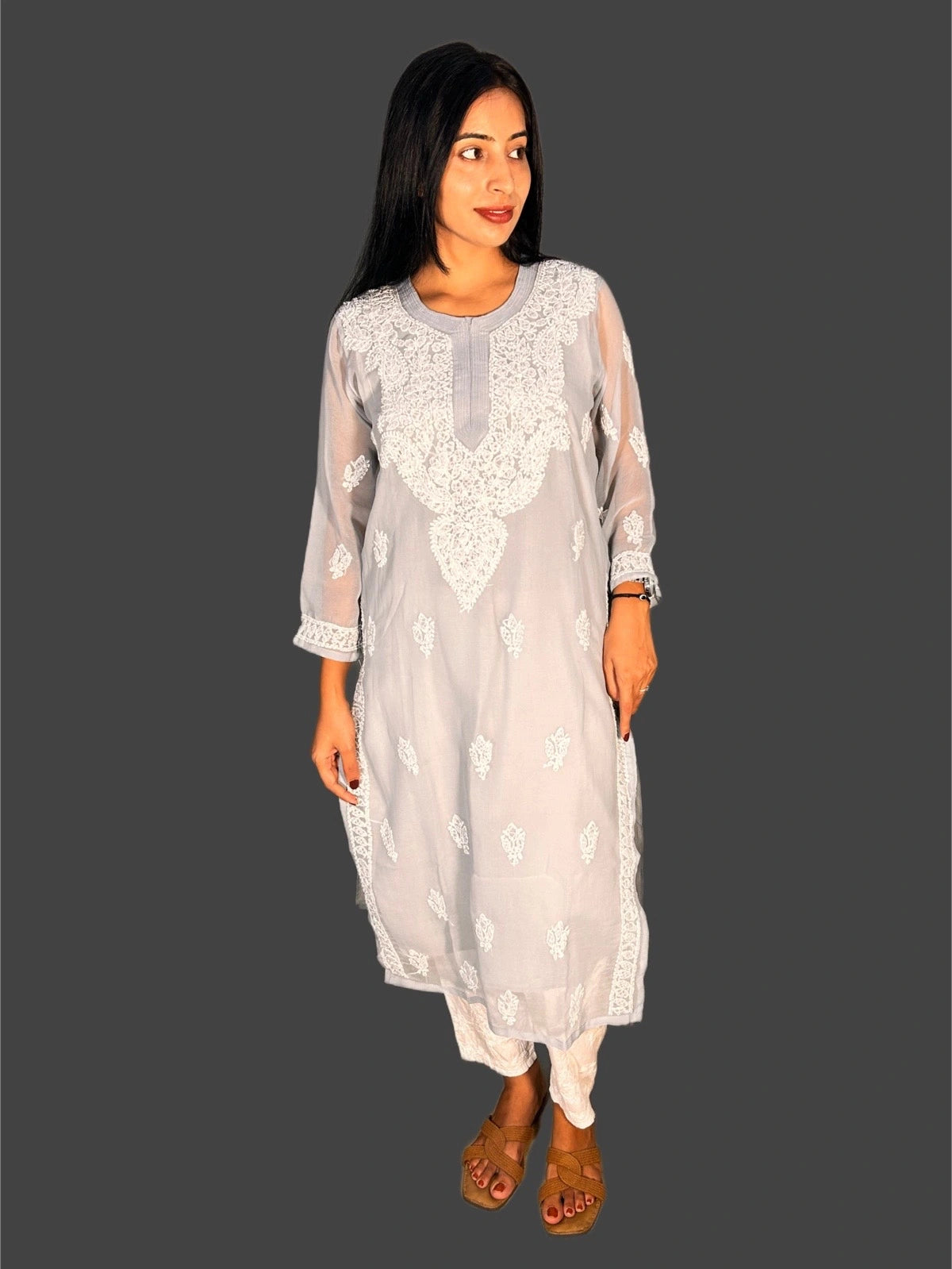 Luxurious georgette fabric gives this Lucknowi Chikankari Grey Georgette Kurti a light, flowy drape that is perfect for any occasion. The intricate and traditional chikankari embroidery adds a touch of elegance and sophistication. Elevate your style with this versatile and timeless kurti.