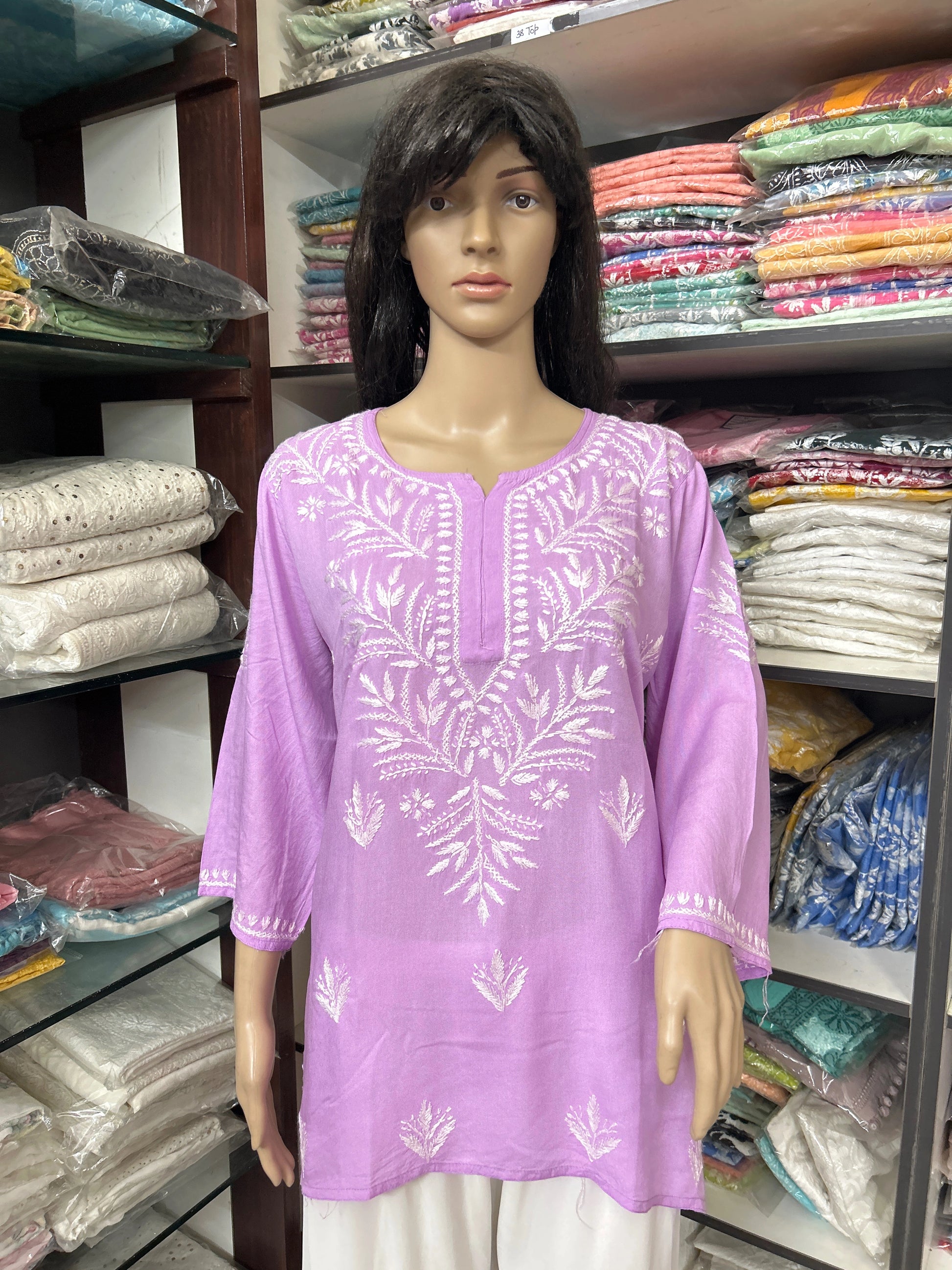 Lucknowi Chikankari Lavender 'Jamuni' Rayon Short Kurti-T000070