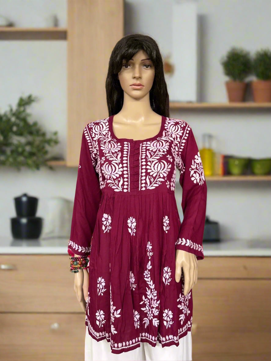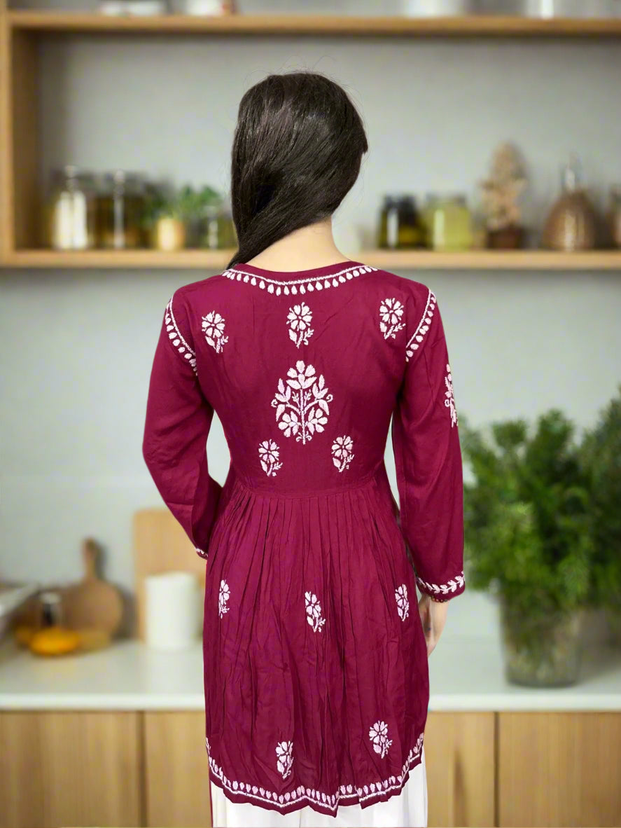 Lucknowi Chikankari Maroon Modal Short Kurti-T000039