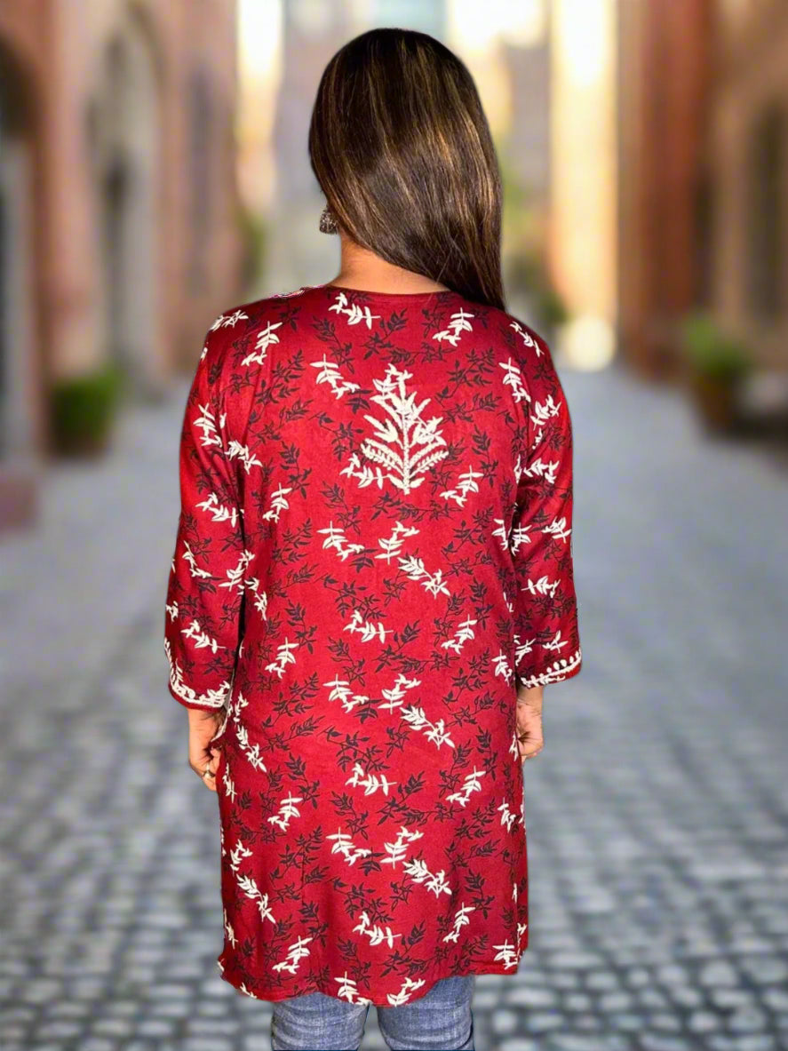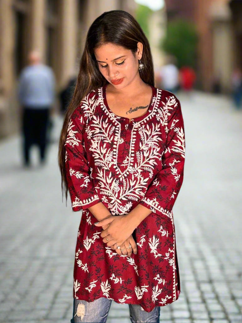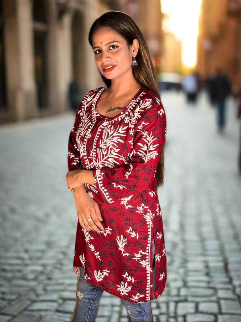 Lucknowi Chikankari Maroon Printed Rayon Short Kurti-T000014