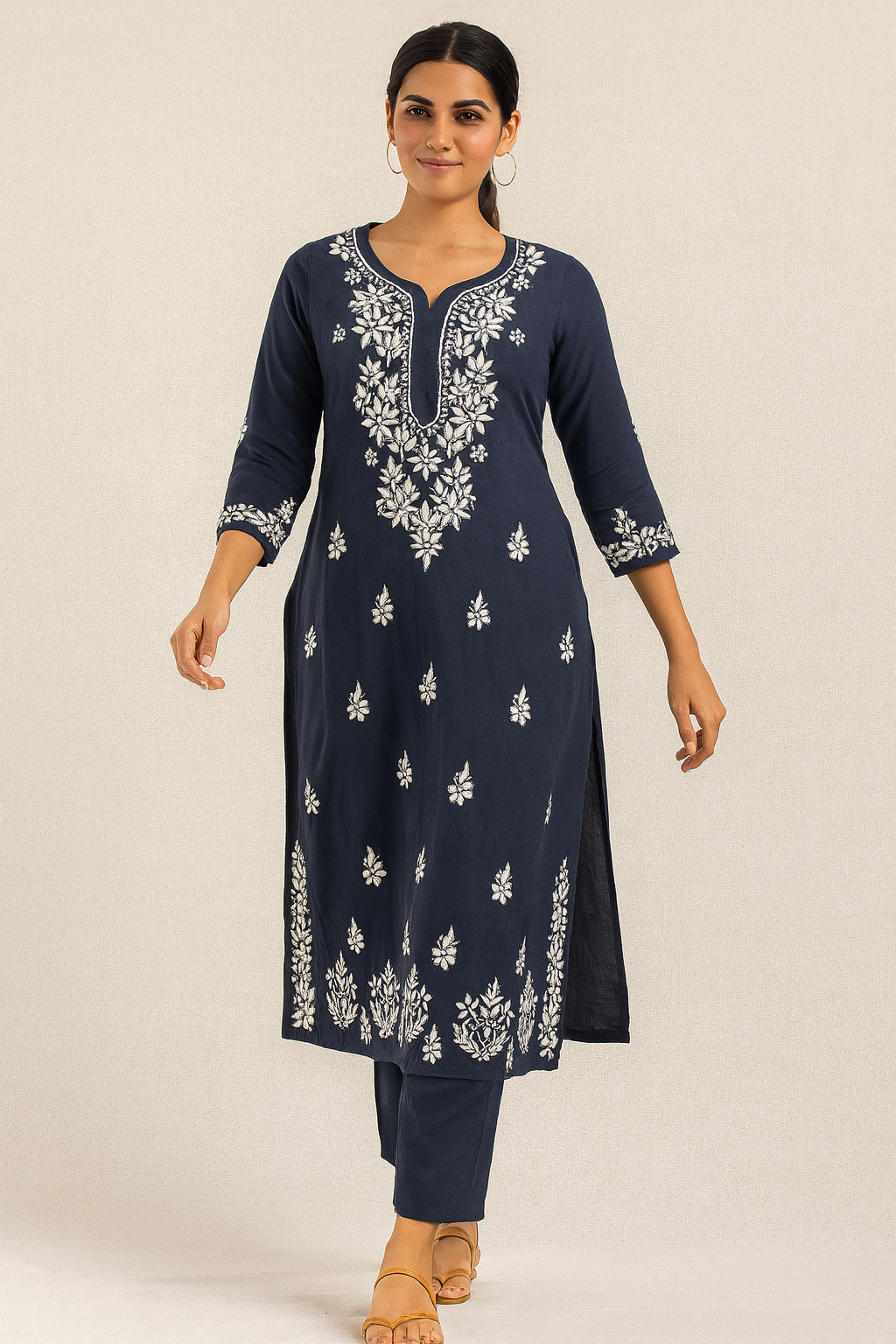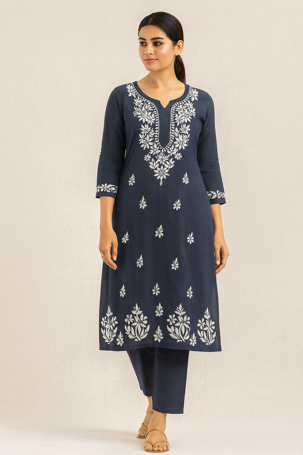 Indulge in timeless grace with this navy blue Lucknowi Chikankari kurti, delicately hand-embroidered with intricate white floral motifs. The fine detailing on the neckline, sleeves, and hem makes it a versatile piece – perfect for casual elegance or festive sophistication. This navy blue kurti can be paired with either straight white palazzo pants of slim-fit cigarette trousers in ivory or pastel shades for a modern chic vibe. A light chiffon or organza dupatta with subtle embroidery and minimalist pearl studs for a graceful understated look is a style mantra.