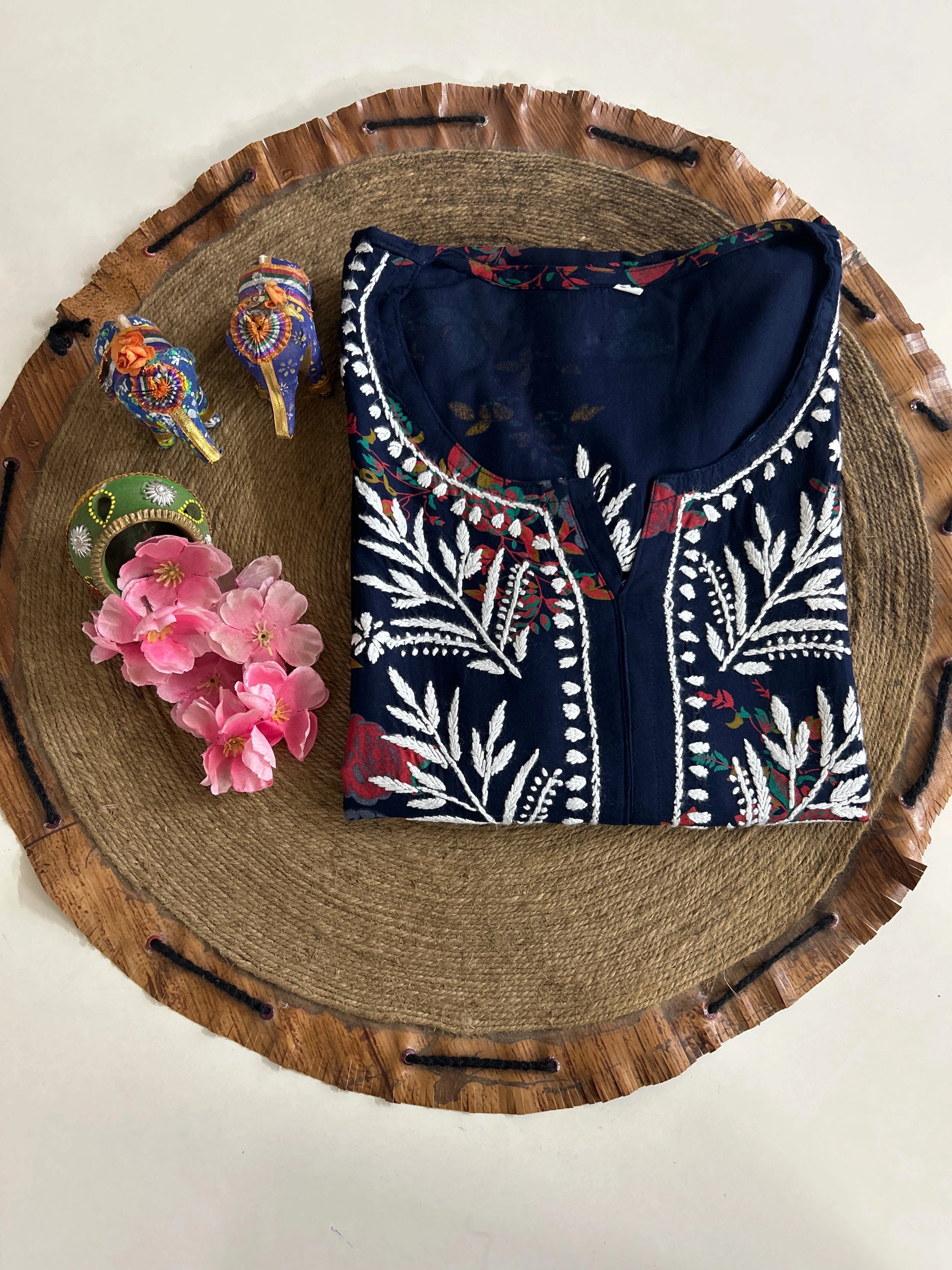 Lucknowi Chikankari Navy Blue 'Aab-e-Asmaan' Printed Rayon Kurti-K30079