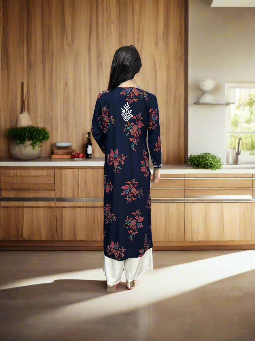 This Lucknowi Chikankari Navy Blue Printed Kurti is crafted from high-quality rayon fabric, known for its softness and durability. The intricate print adds a touch of elegance, while the lightweight and breathable material ensures comfort all day long. Expertly designed with a blend of style and functionality, this kurti is a must-have in any wardrobe.