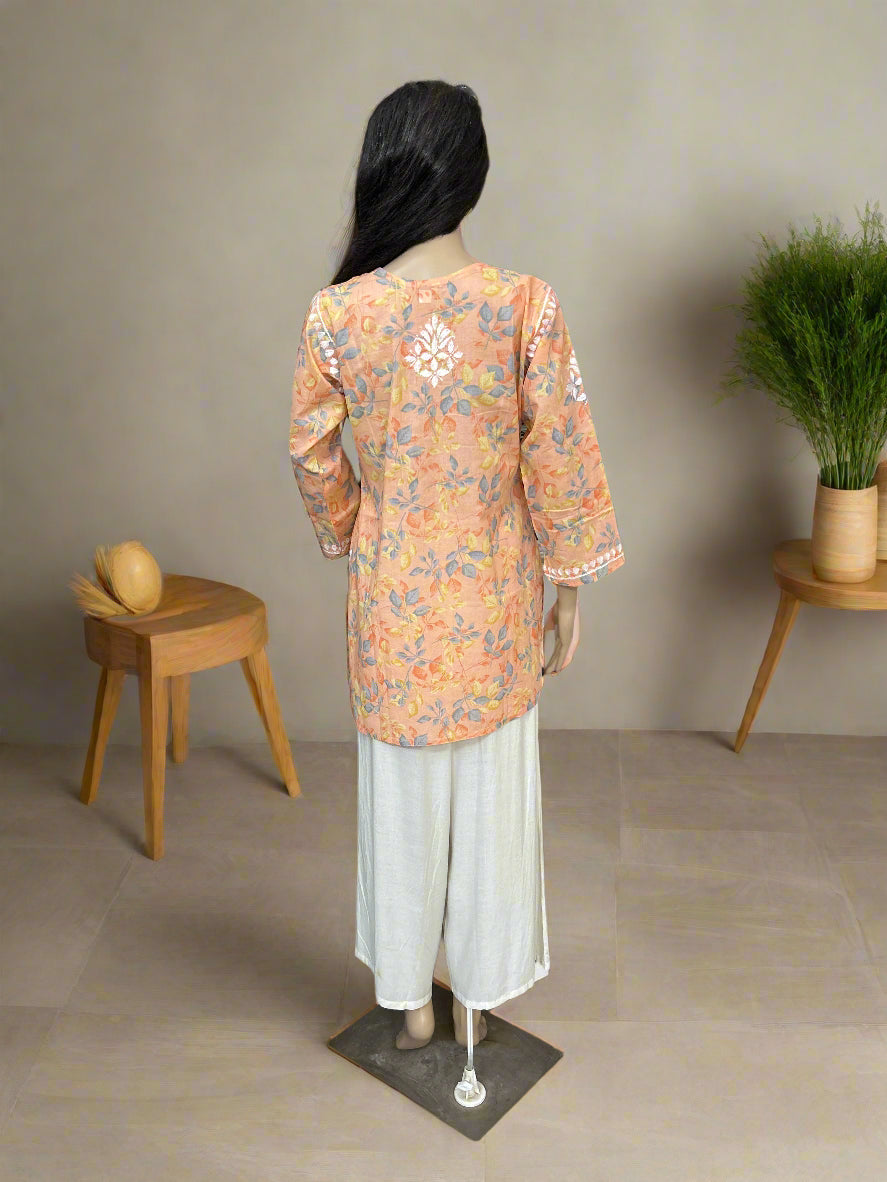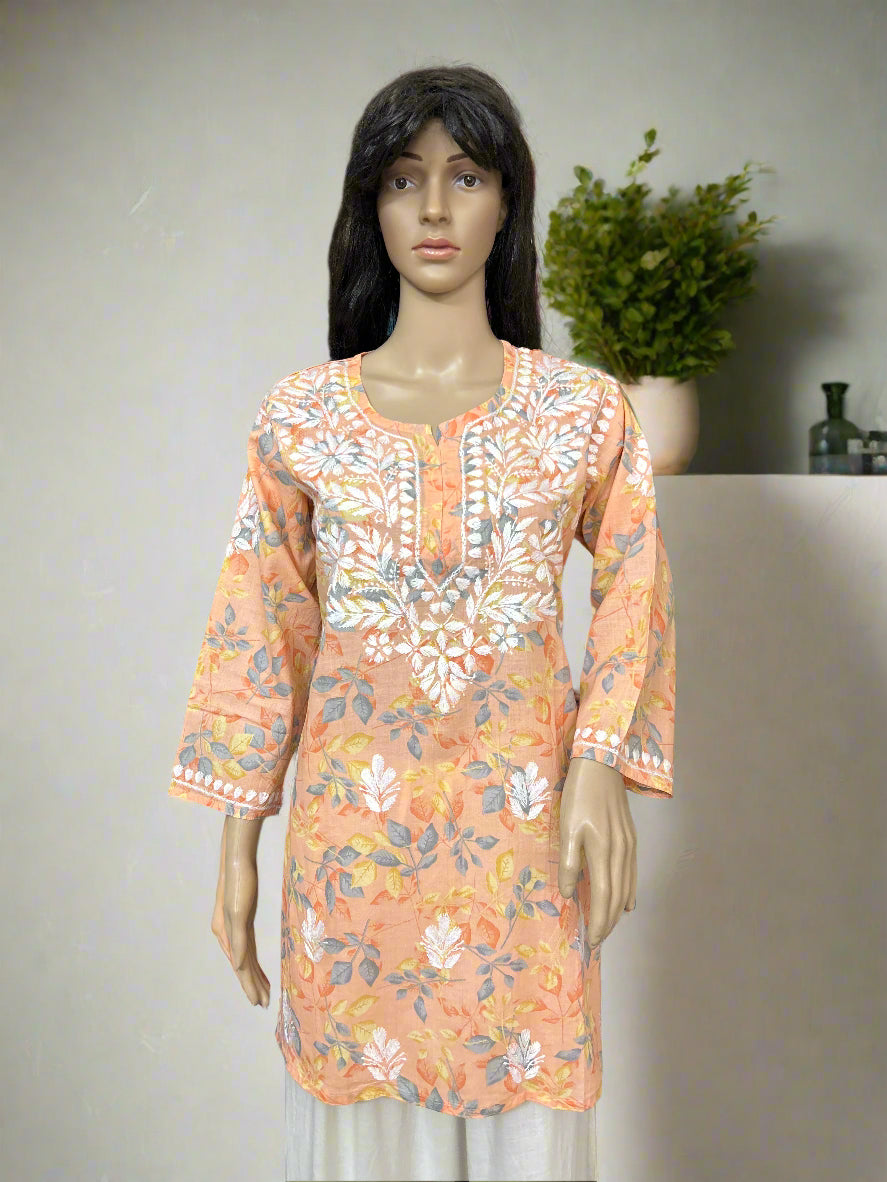 Lucknowi Chikankari Orange Printed Cotton Short Kurti-K000044