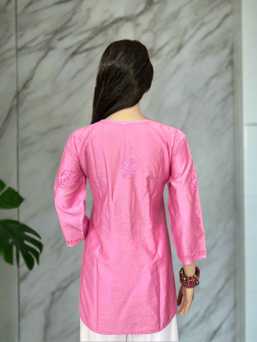 Lucknowi Chikankari Pink Chanderi Short Kurti-T40006