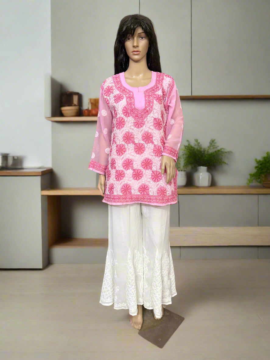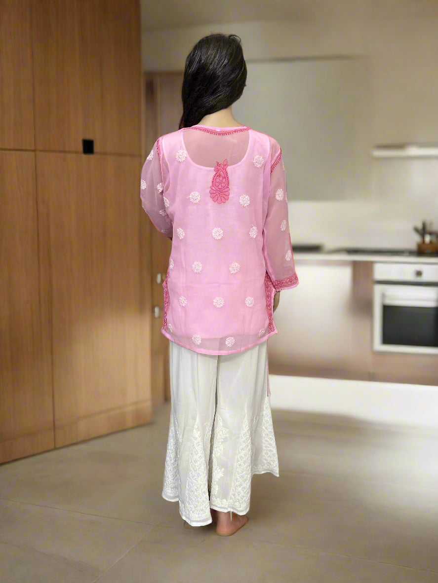 Lucknowi Chikankari Pink Georgette Short Kurti-T40002
