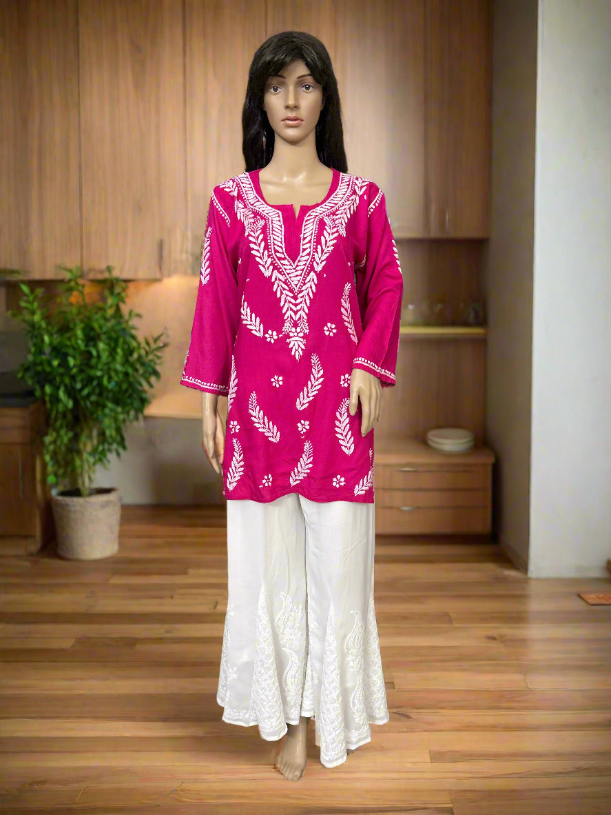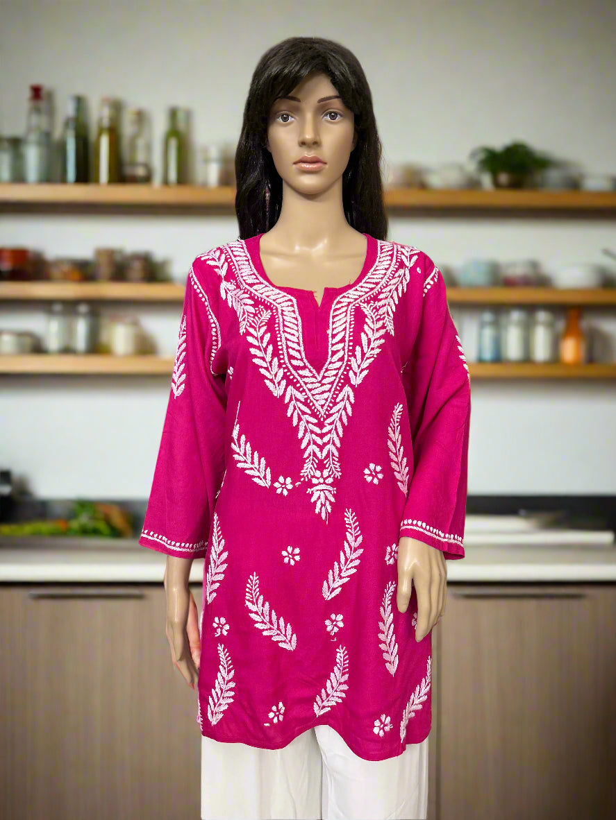 Lucknowi Chikankari Pink Rayon Short Kurti-T000078