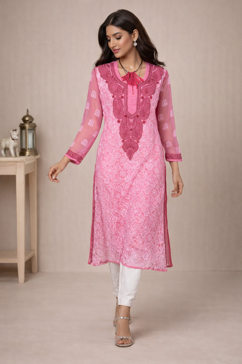 Lucknowi Chikankari Pink 'Shagufta' Georgette Kurti-K40001