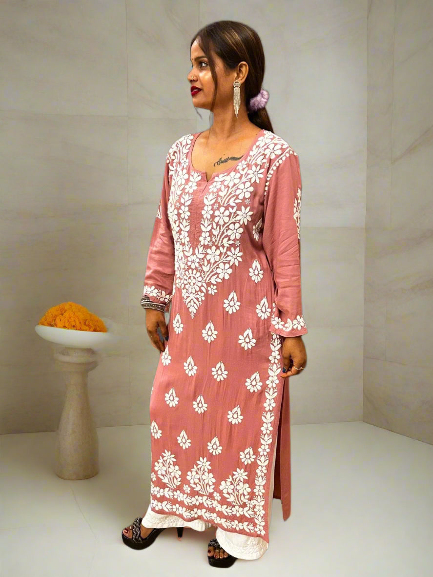 Lucknowi Chikankari Pinkish Mauve Modal Kurti-K000121