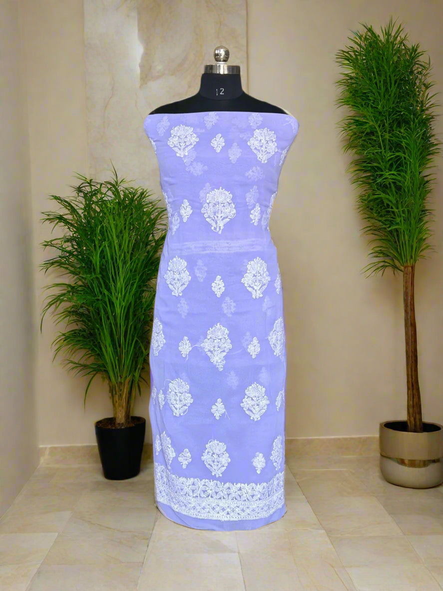 This elegant Lucknowi Chikankari Kurta-Bottom-Dupatta fabric is made of premium quality georgette, ensuring a lightweight and breathable experience. Perfect for special occasions, the purple color adds a touch of sophistication. Elevate your wardrobe with this versatile fabric.