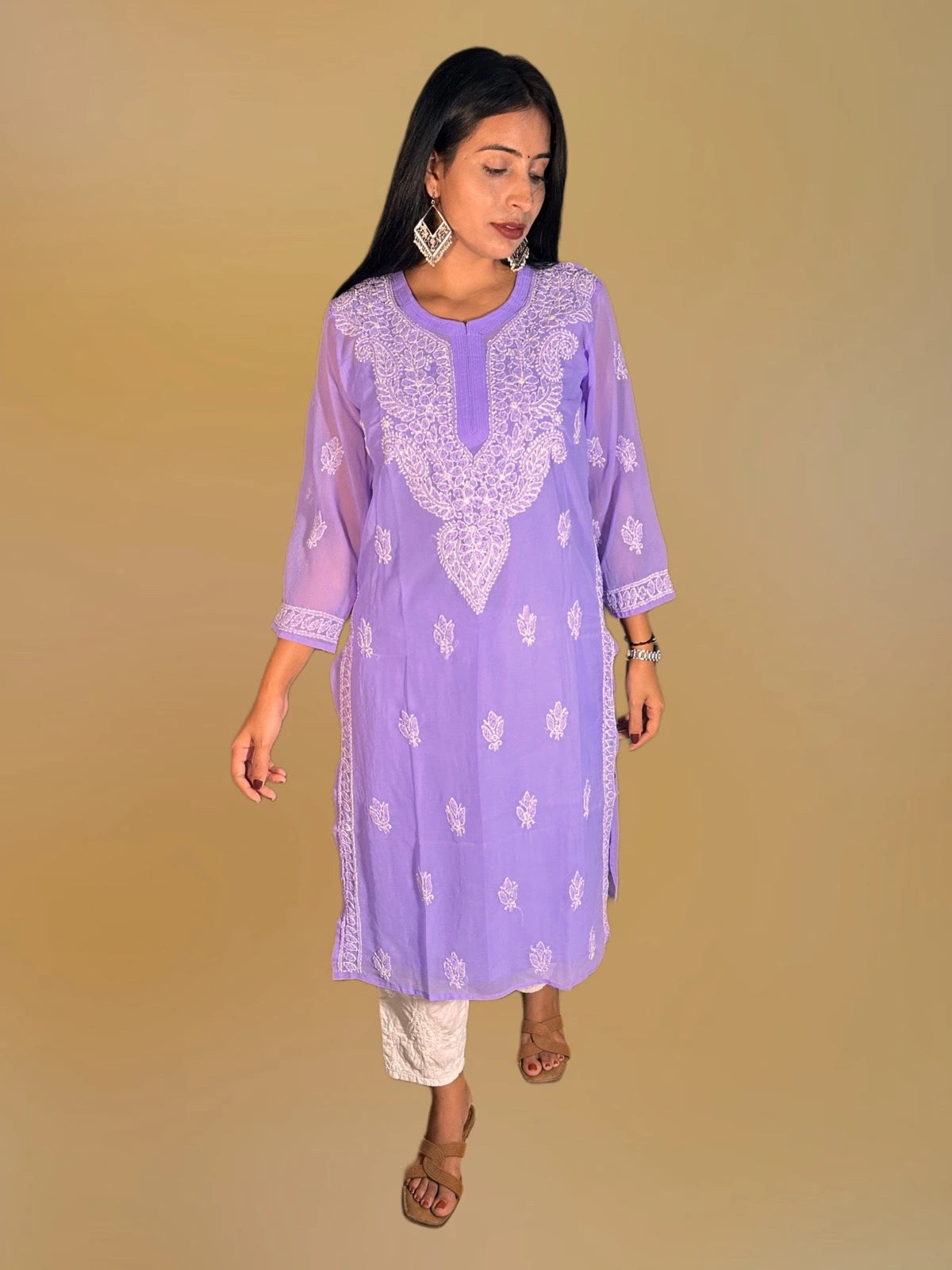 This purple georgette kurti features authentic hand-crafted Lucknowi chikankari, celebrating timeless Indian handicraft artistry. The neckline with button patti is richly and finely embroidered, creating a strong focal highlight, while the rest of the kurti—front and back—is kept lighter with subtle motifs for an elegant, airy finish. Graceful yet versatile, this kurti can be styled with white trousers for a classic look, contrast bottoms for a contemporary appeal, or layered with dupattas and accessories to create multiple day-to-festive looks with ease.