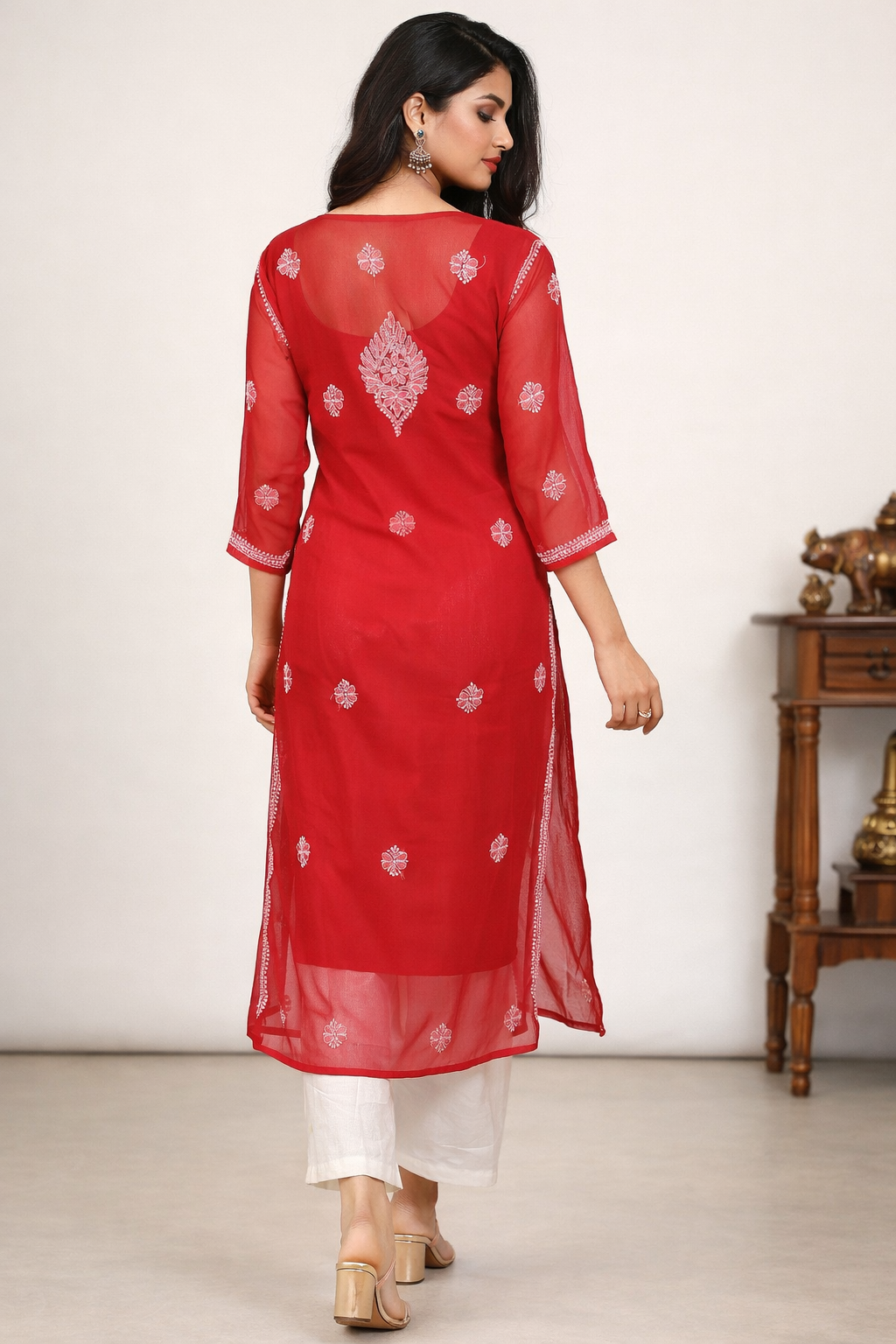 Lucknowi Chikankari Red 'Surkh' Georgette Kurti-K30050