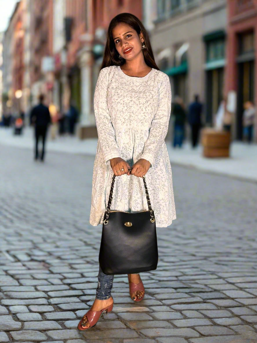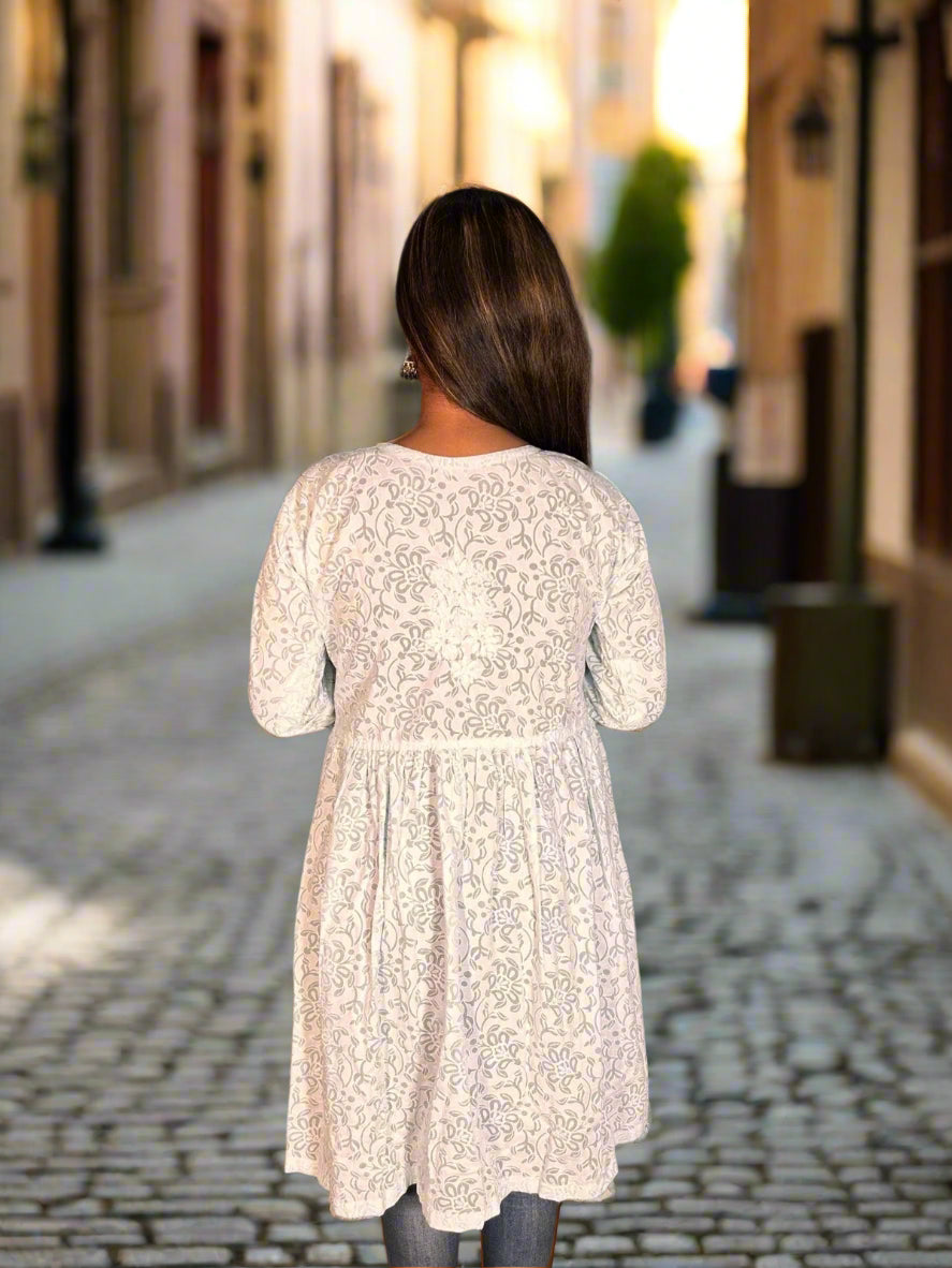 Expertly crafted with traditional Lucknowi chikankari embroidery, this frock-style top is a timeless piece to add to your wardrobe. Made from breathable cotton, it offers both comfort and style. Enhance your look with its intricate print and elegant design.