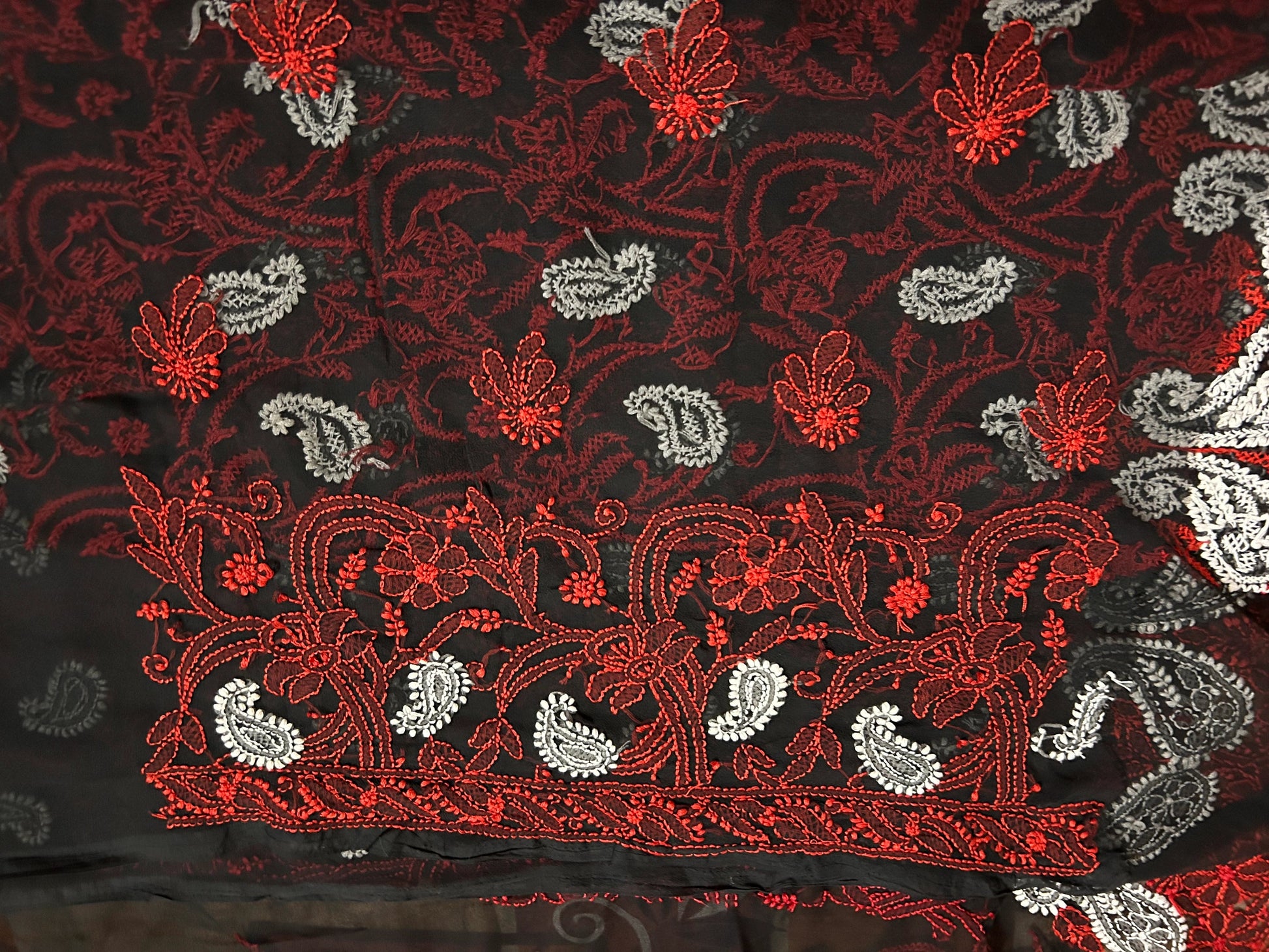 Exquisitely handcrafted Lucknowi Chikankari kurta fabric in rich black georgette. This unstitched piece showcases the traditional embroidery technique perfected by skilled artisans of Lucknow. The intricate threadwork creates a sophisticated contrast against the premium georgette, offering breathability and elegant drape. Perfect for creating a statement ethnic ensemble that transitions seamlessly from formal occasions to festive celebrations.