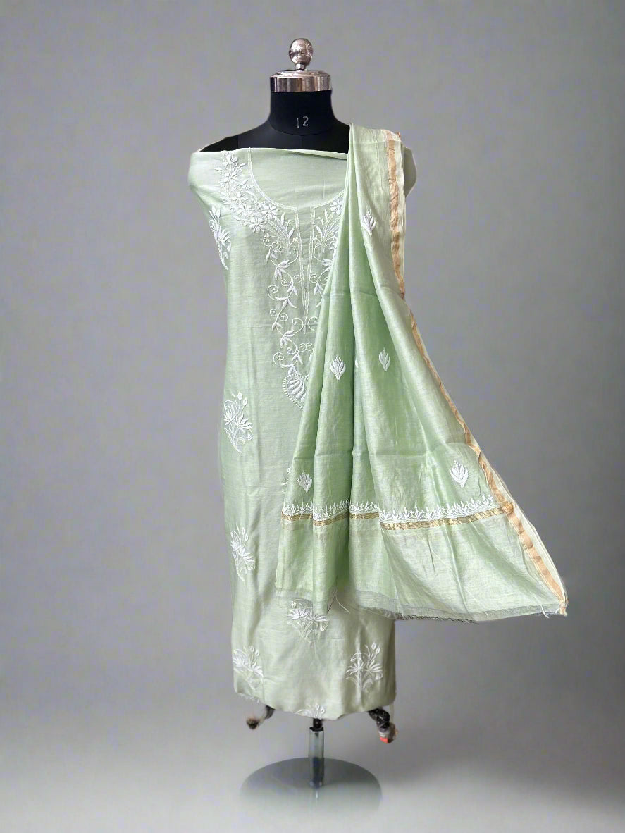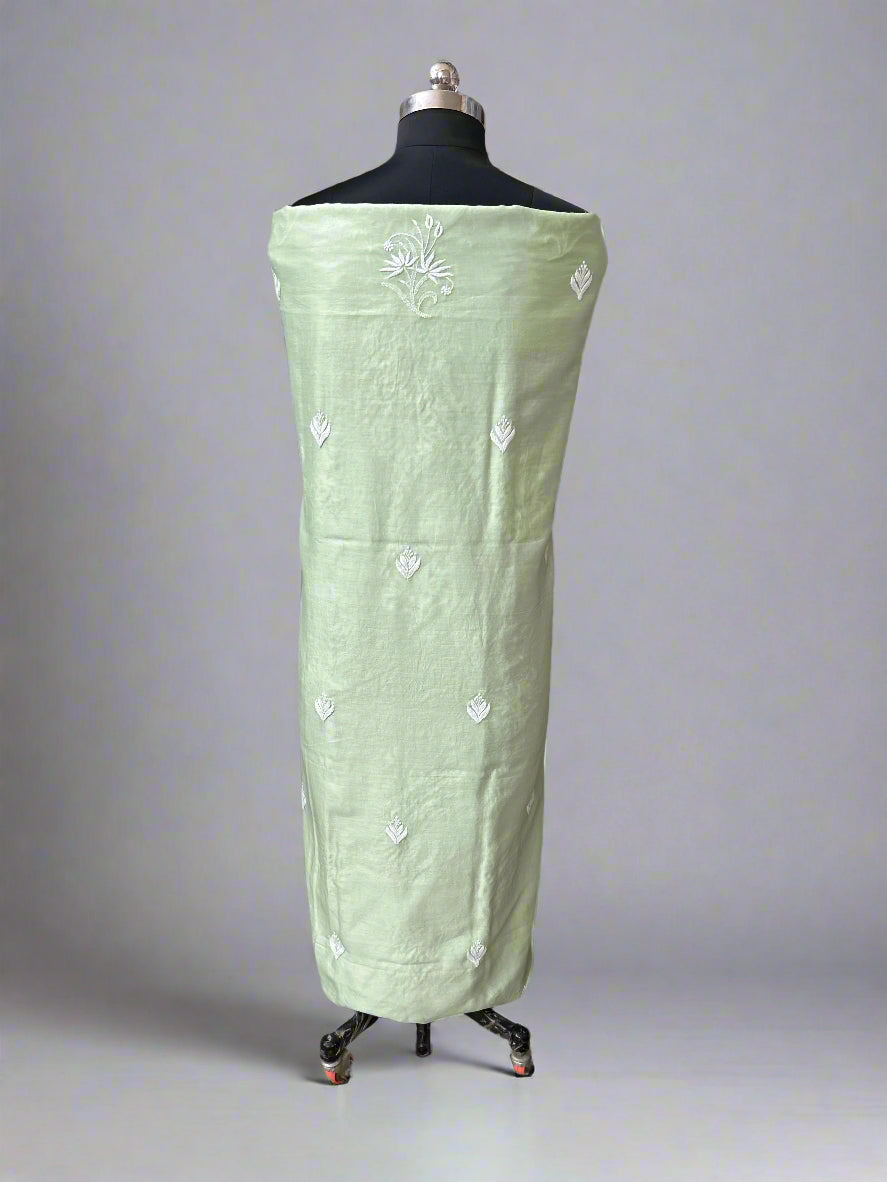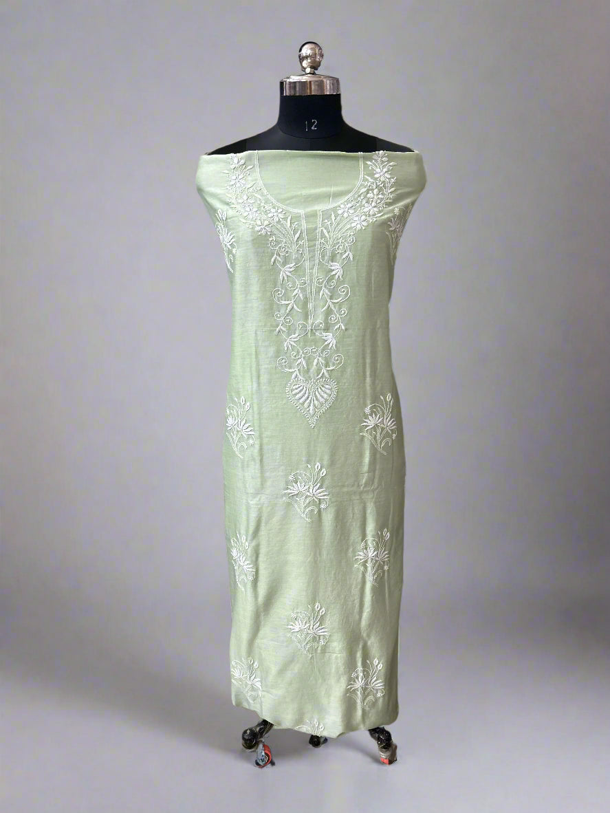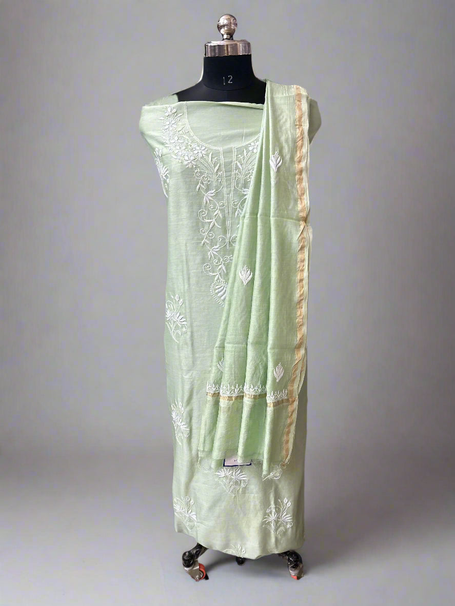 Lucknowi Chikankari Unstitched Green Chanderi Kurta-Dupatta Fabric-PG400049