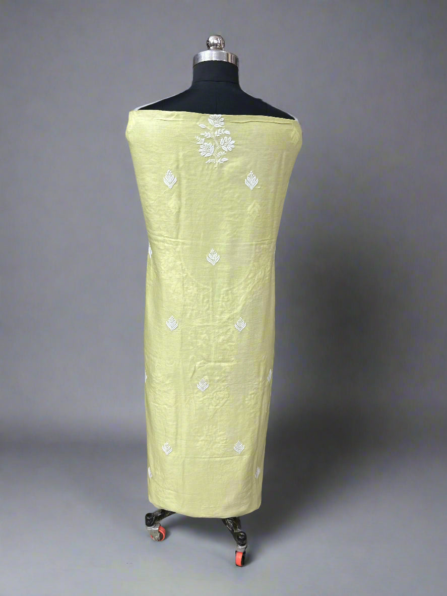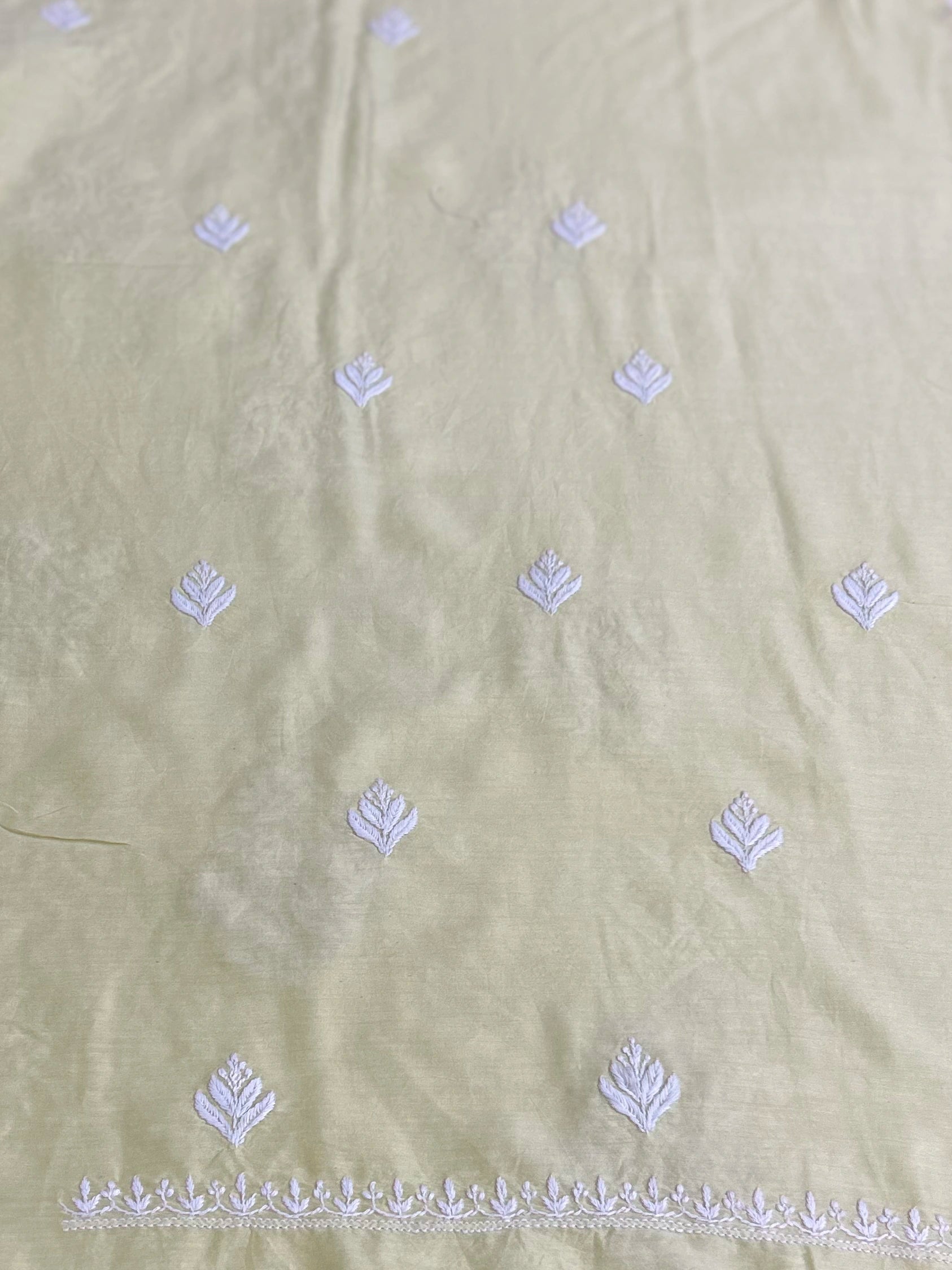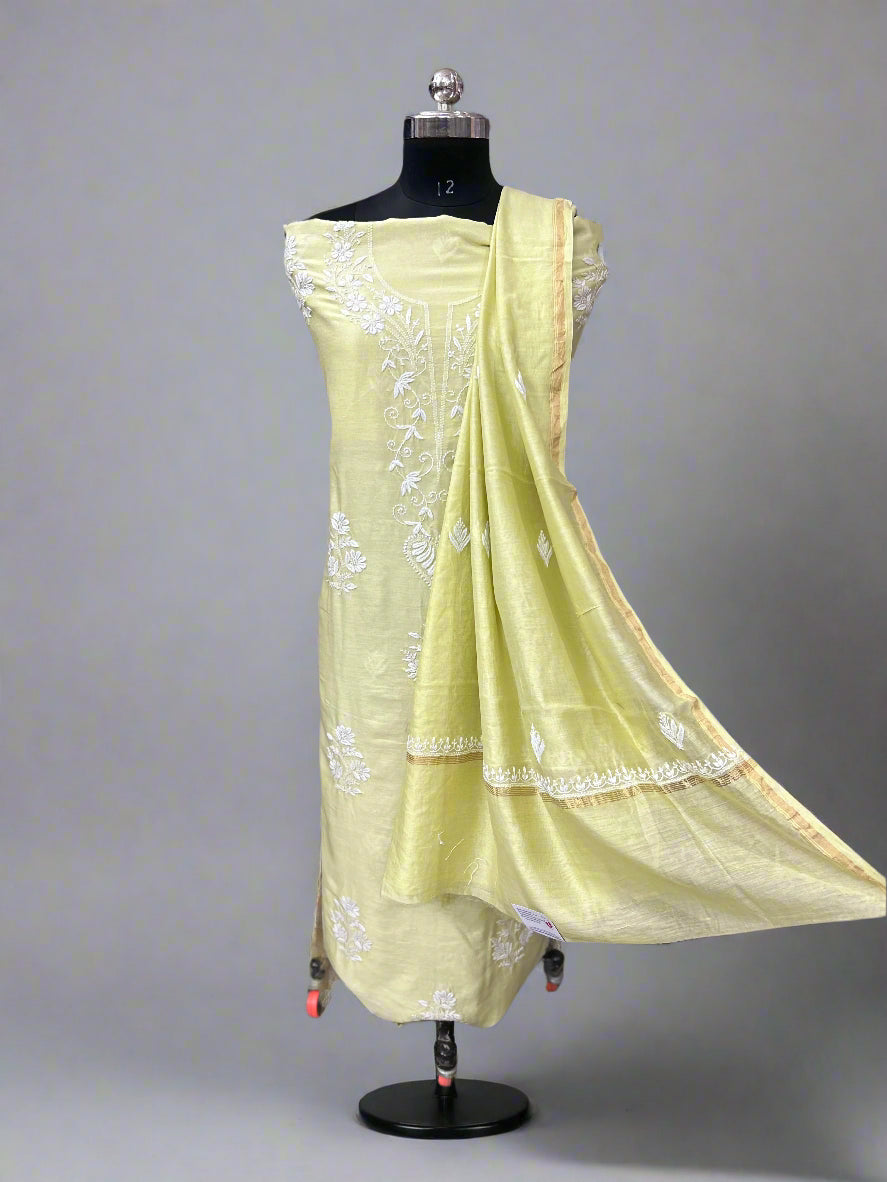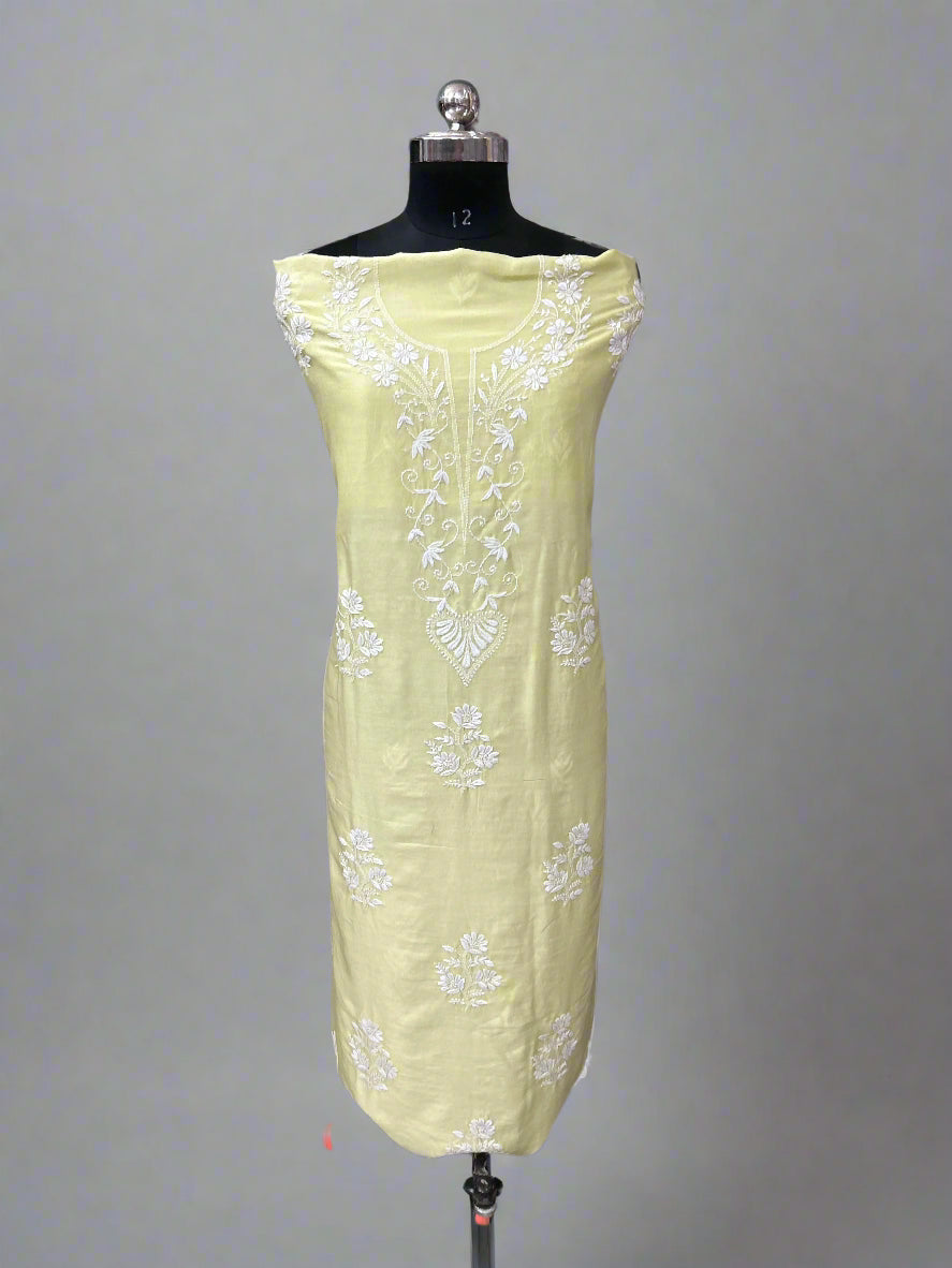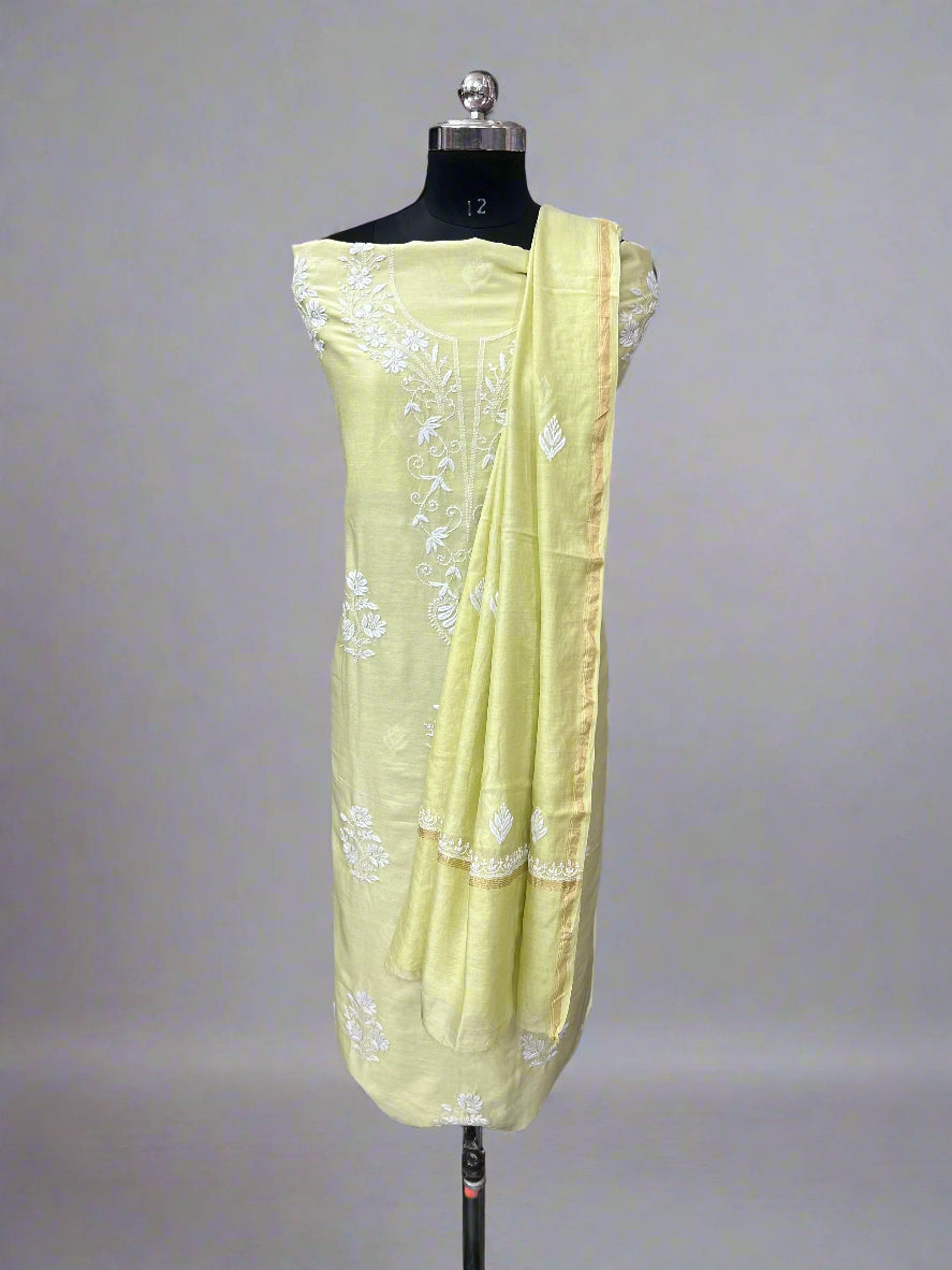 Lucknowi Chikankari Unstitched Greenish Yellow Chanderi Kurta-Dupatta Fabric-PG400050