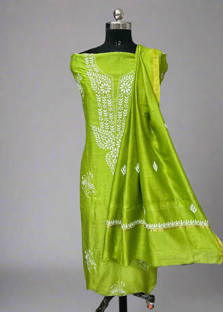 This Lucknowi Chikankari unstitched fabric set features a vibrant neon yellow Chanderi kurta paired with a matching dupatta. The traditional Chikankari embroidery highlights exquisite craftsmanship, offering a perfect blend of elegance and comfort. Ideal for custom tailoring, this fabric allows you to create a refined outfit that showcases the rich heritage of Lucknow’s embroidery artistry while ensuring a bright, contemporary look.