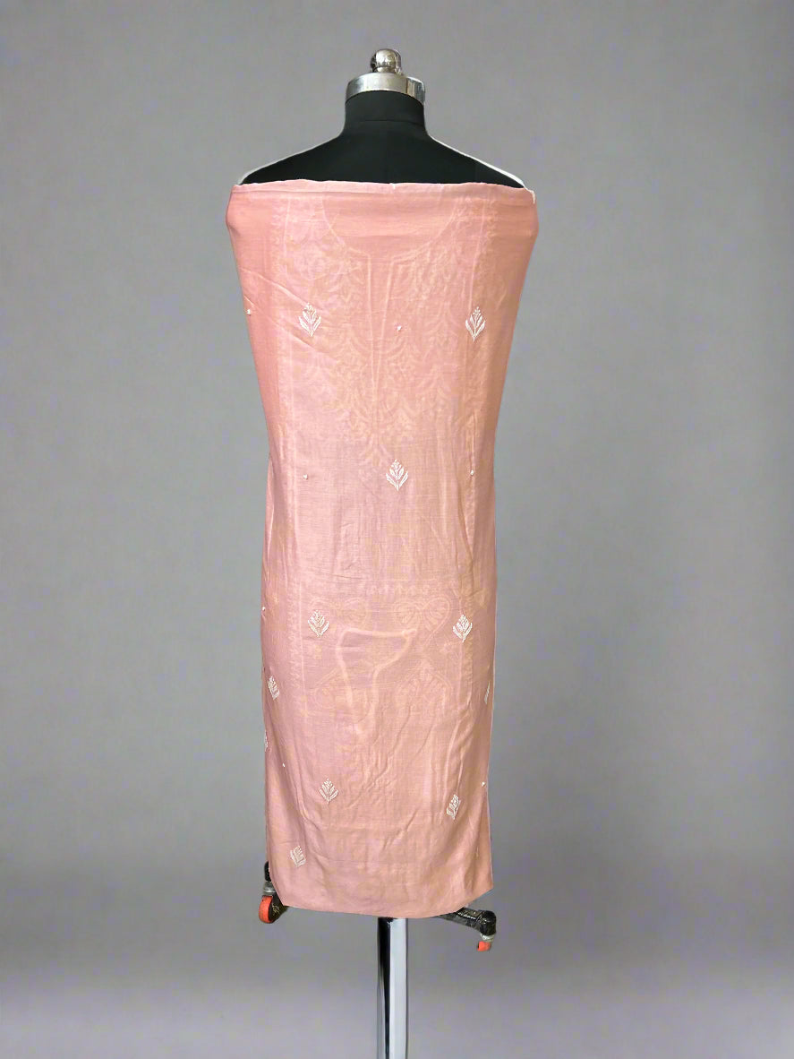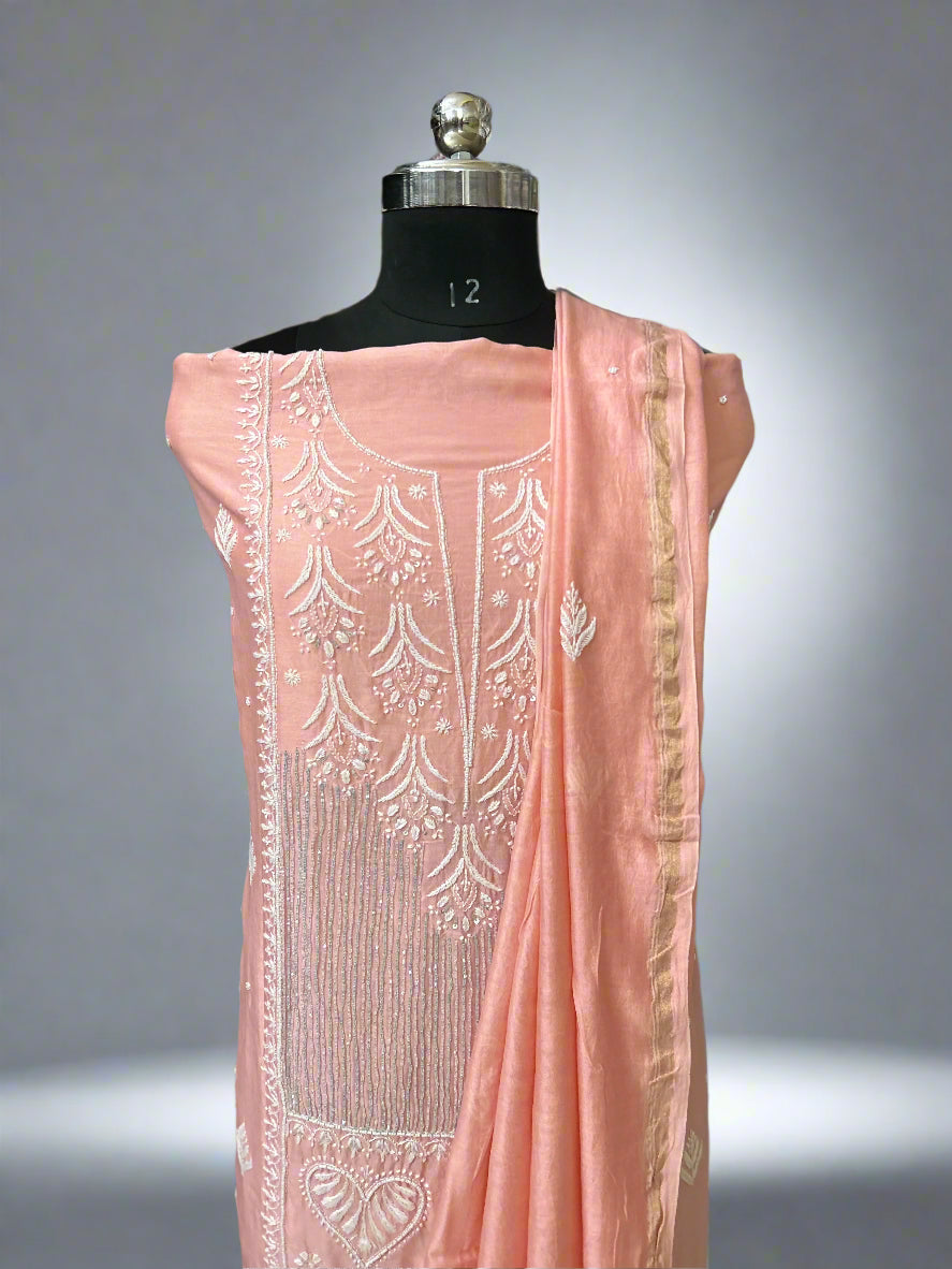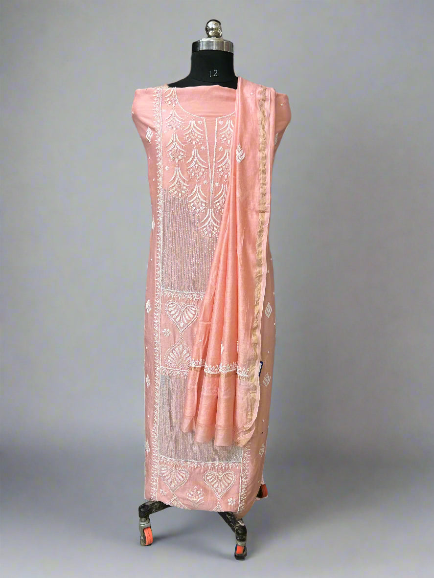 Lucknowi Chikankari Unstitched Peach Chanderi Kurta-Dupatta Fabric-PG400046
