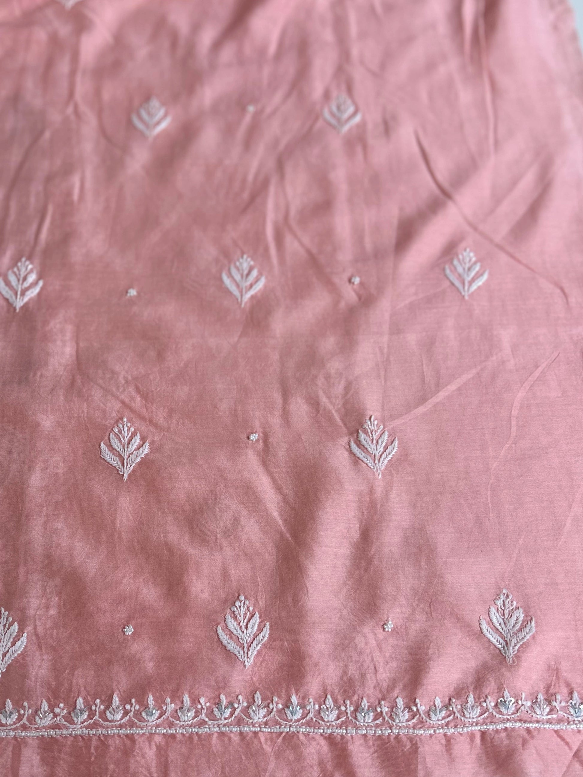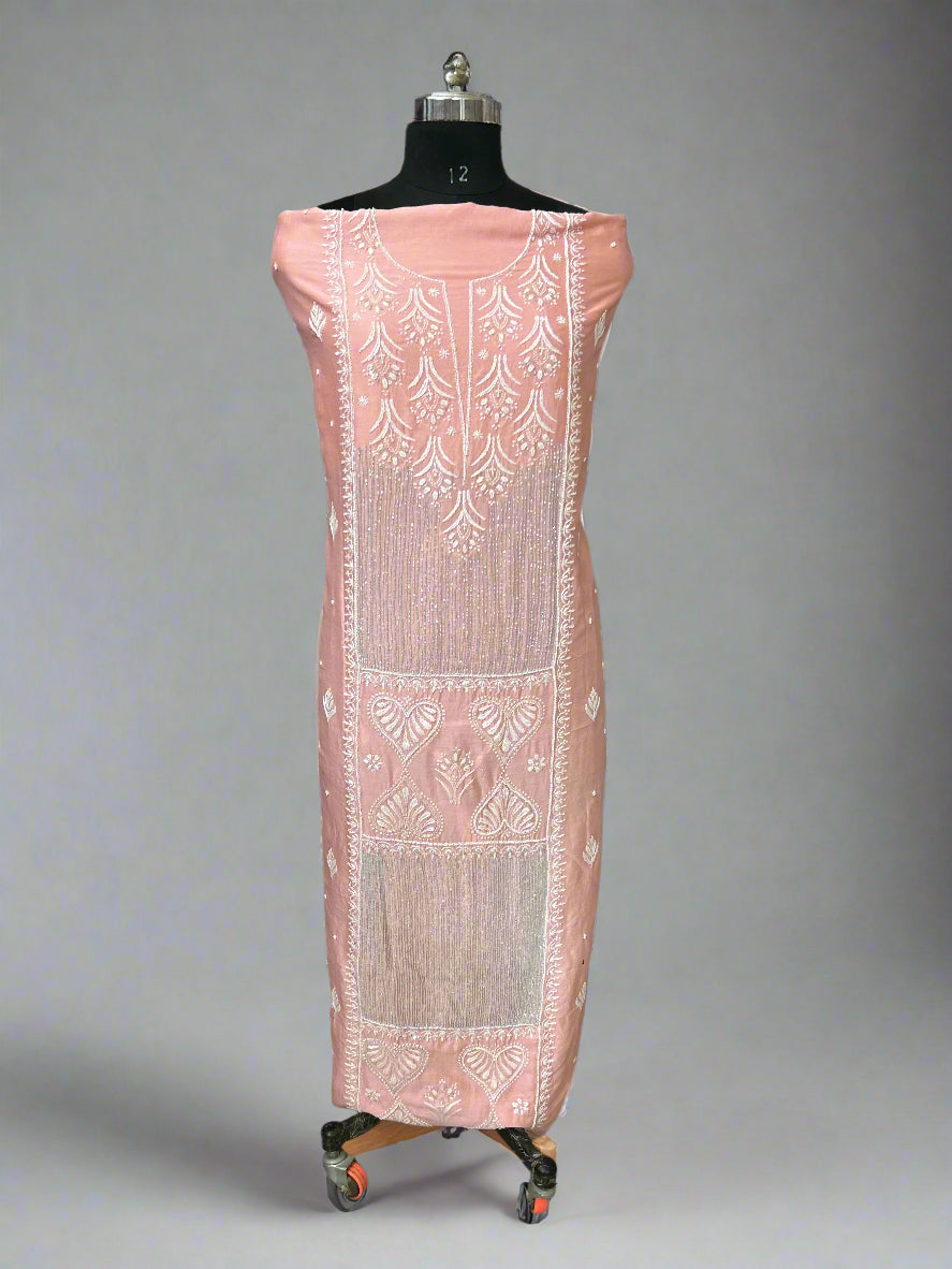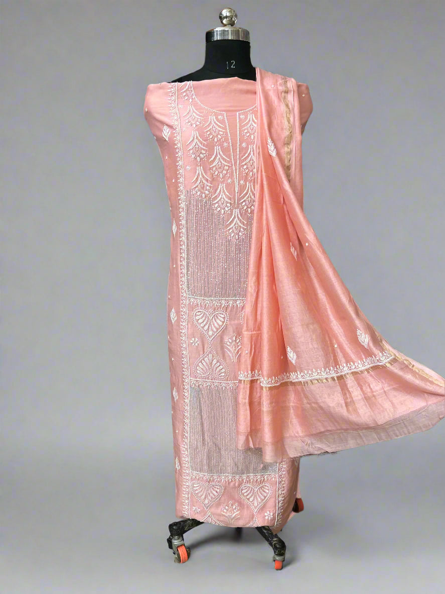 Lucknowi Chikankari Unstitched Peach Chanderi Kurta-Dupatta Fabric-PG400046