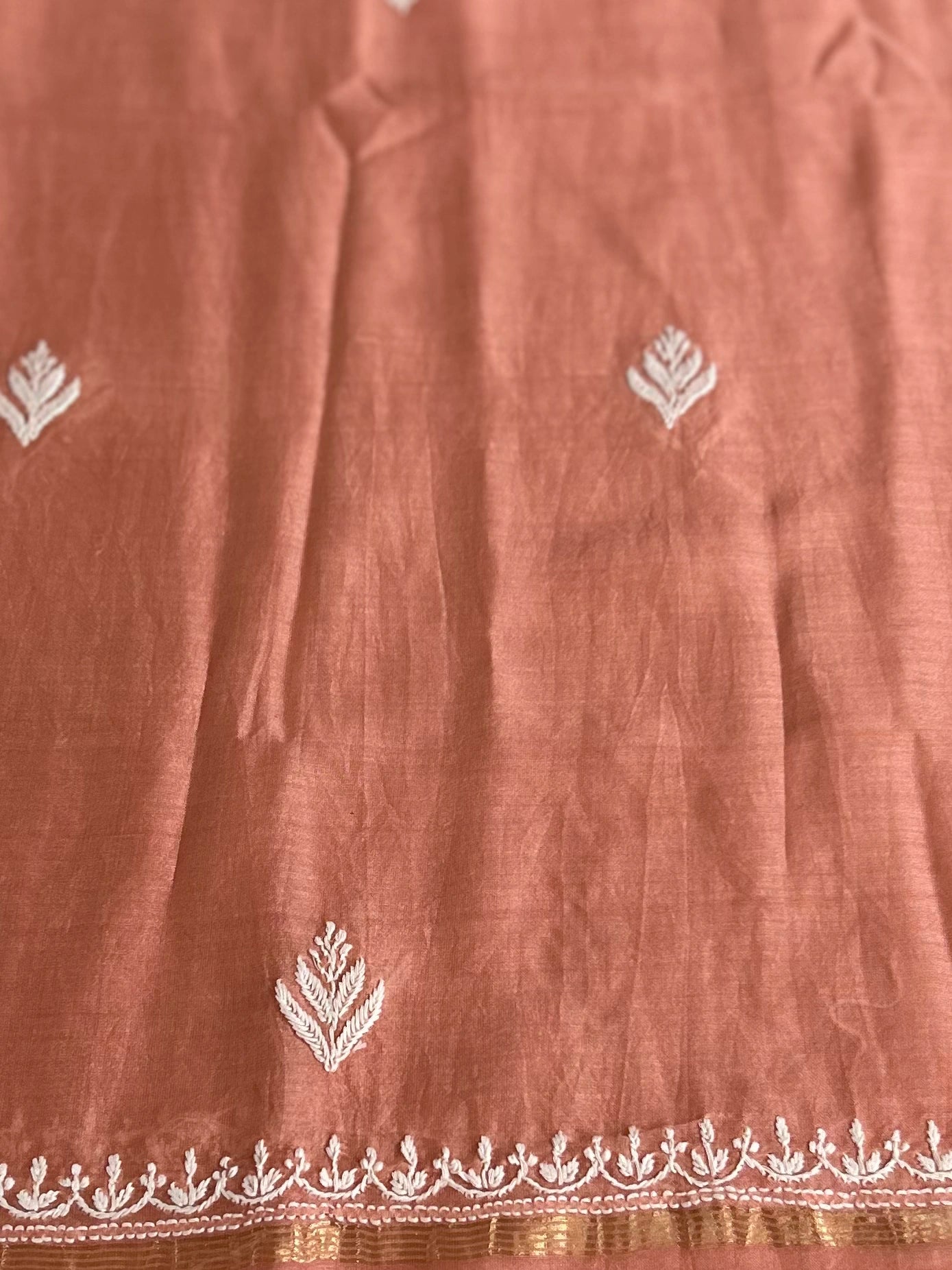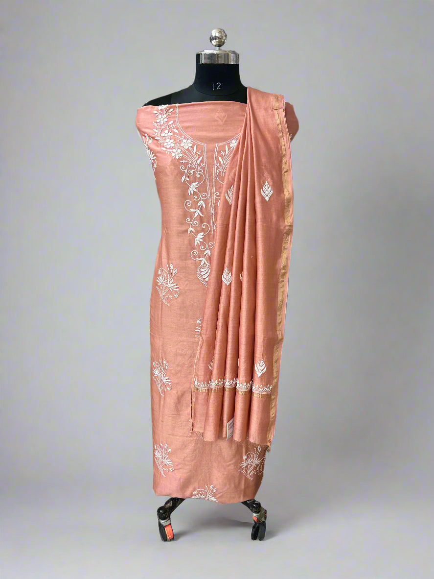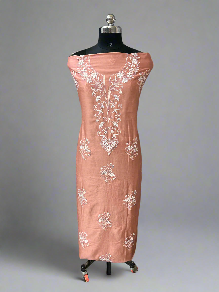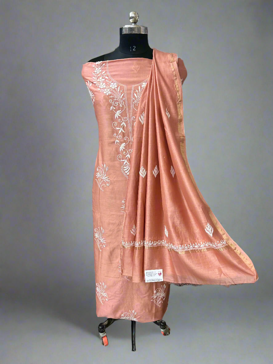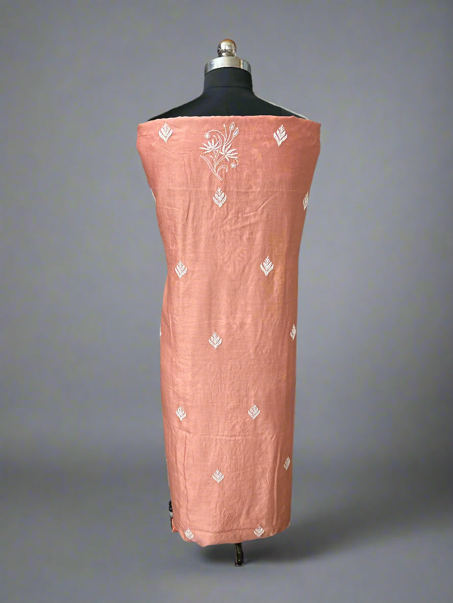 Lucknowi Chikankari Unstitched Peach Chanderi Kurta-Dupatta Fabric-PG400048