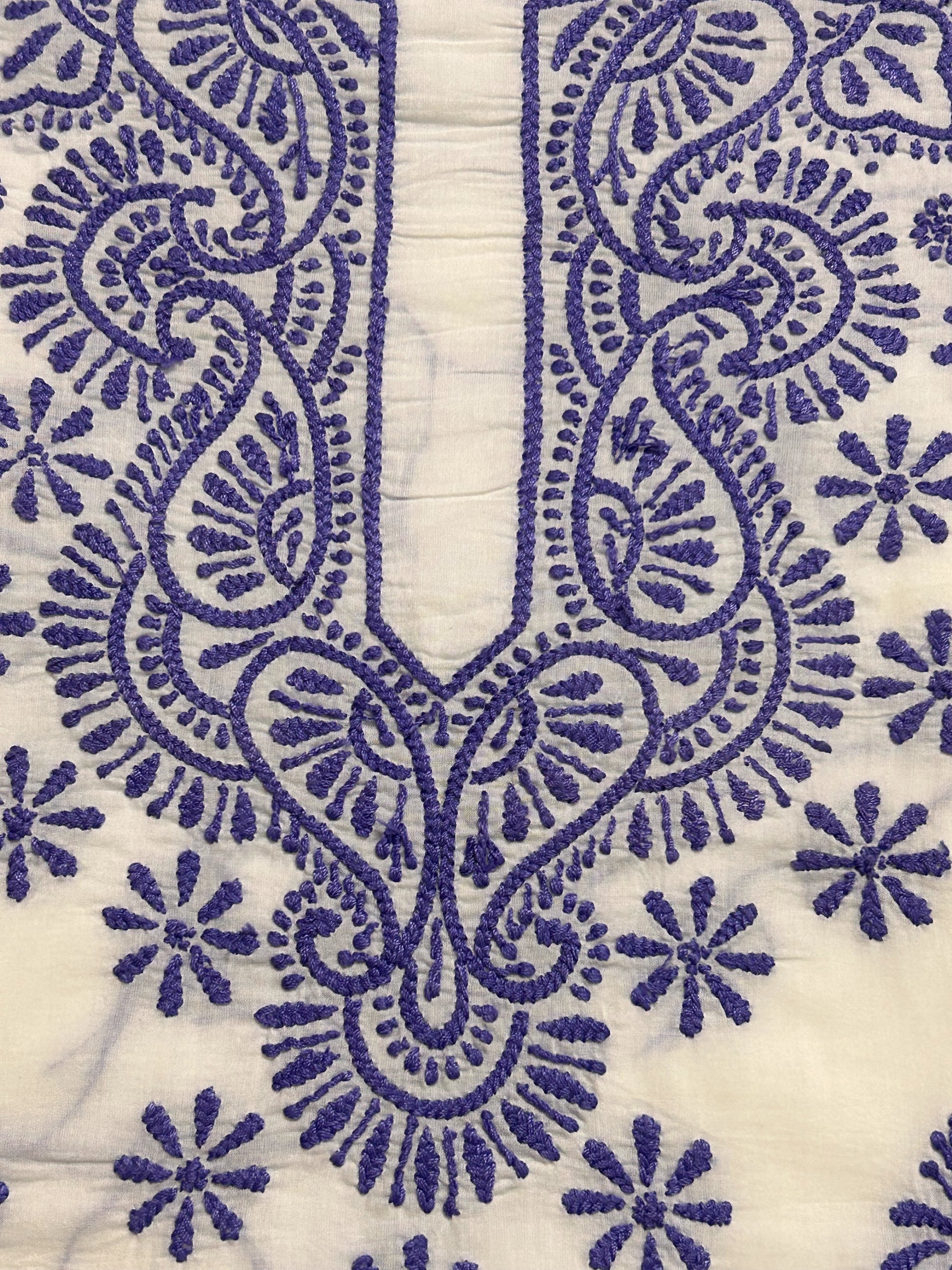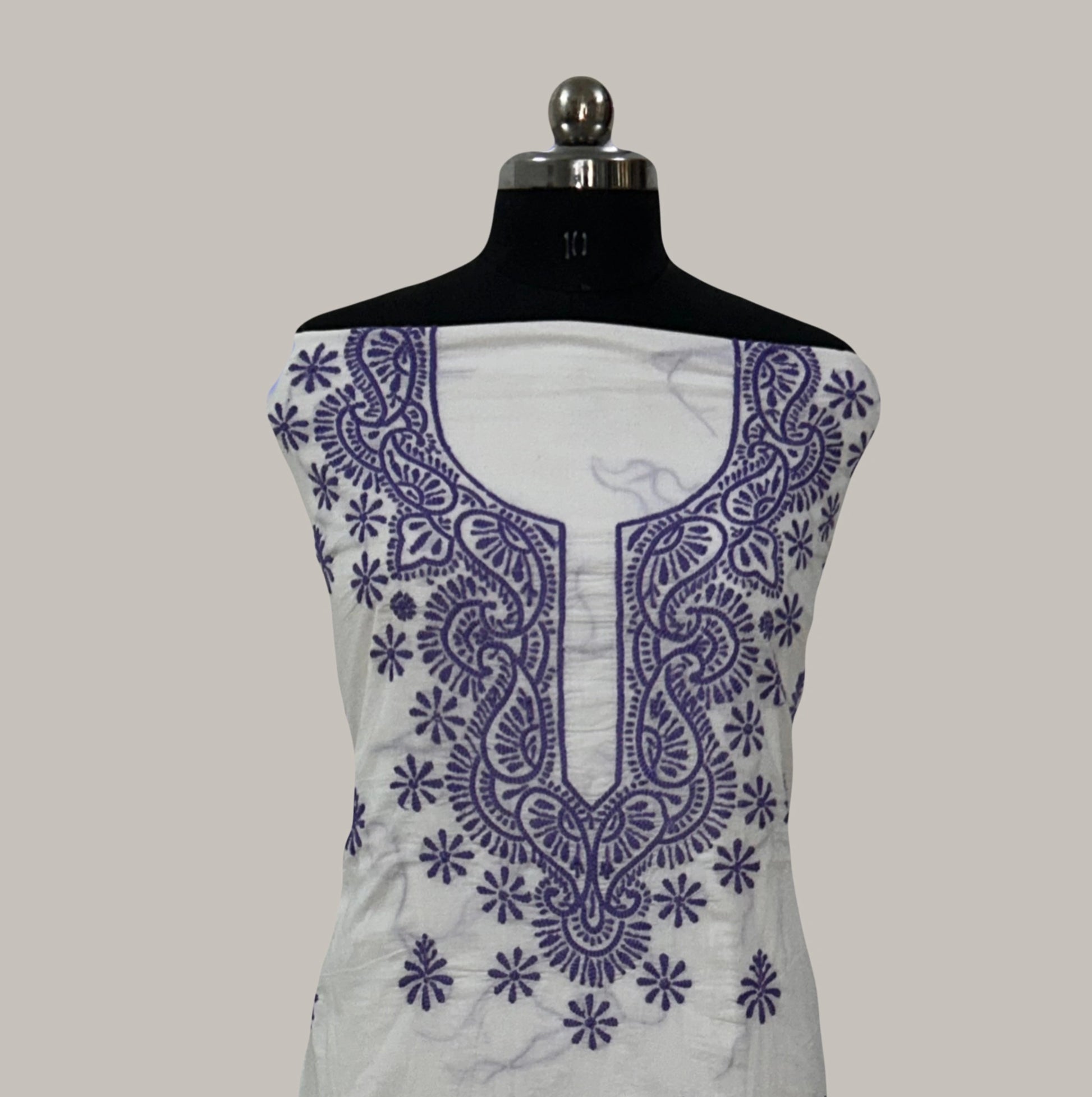 This Lucknowi Chikankari unstitched white cotton fabric set features intricate traditional embroidery, embodying the rich heritage of Lucknow. Crafted from breathable cotton, it ensures comfort and elegance for any occasion. The fine chikankari work adds subtle sophistication, making it ideal for personalized tailoring to achieve a bespoke fit and style. Perfect for those seeking authentic craftsmanship combined with everyday wearability.
