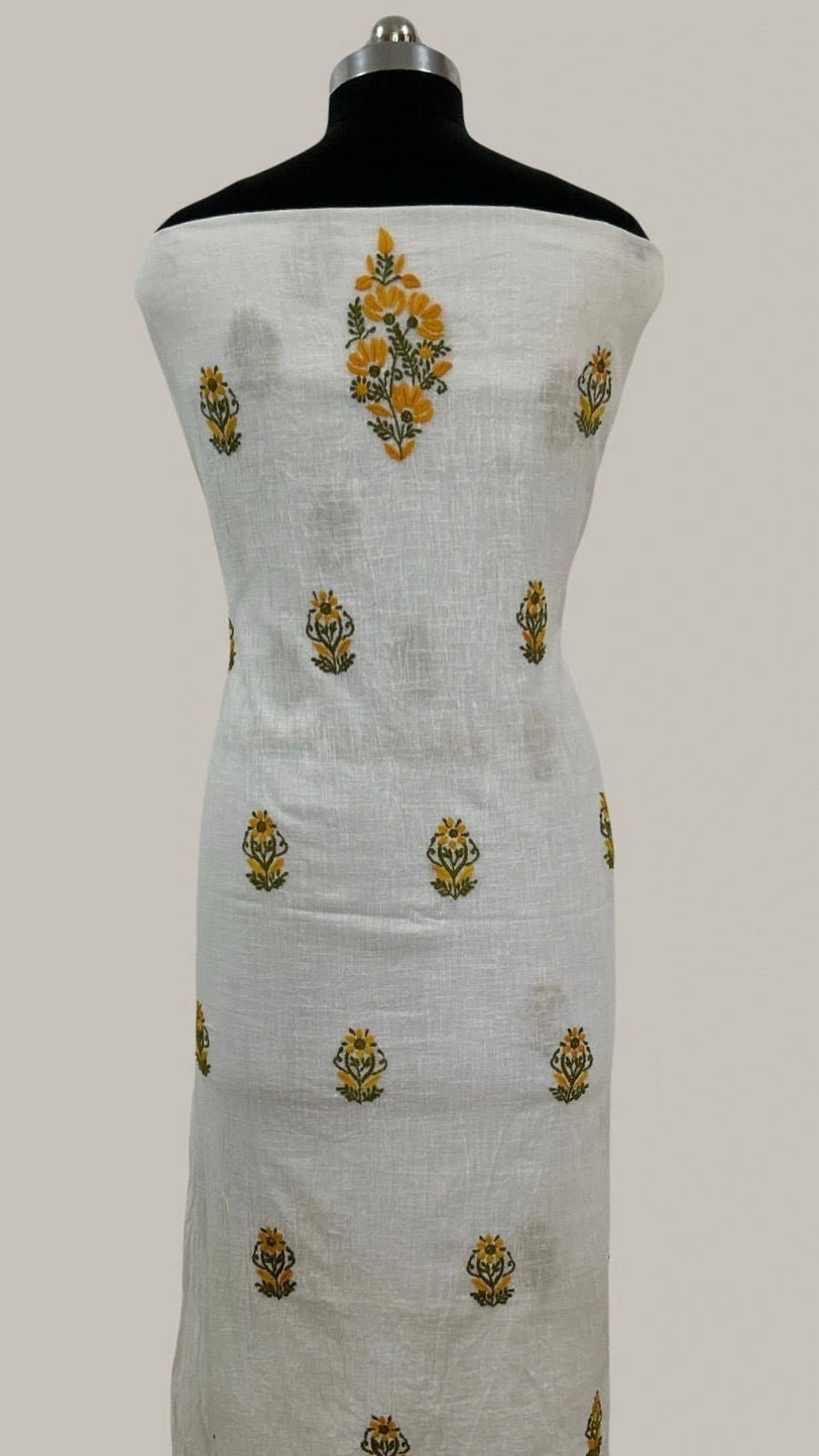 Exquisitely handcrafted Lucknowi Chikankari unstitched slub-cotton fabric featuring traditional embroidery techniques perfected over generations. This premium white cotton material offers breathability and comfort ideal for summer wear. The intricate threadwork showcases authentic craftsmanship from Lucknow's master artisans, making each piece a testament to India's rich textile heritage.
