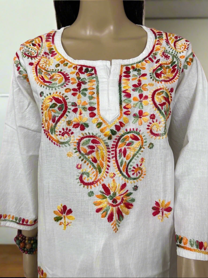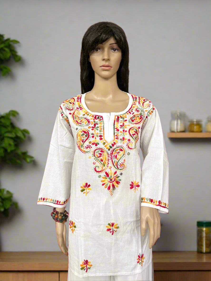 This white Lucknowi Chikankari short kurti is made from premium quality cotton. It features traditional Indian embroidery known for its delicate and intricate patterns. Enhance your wardrobe with this stylish and versatile piece that combines classic design with modern comfort.