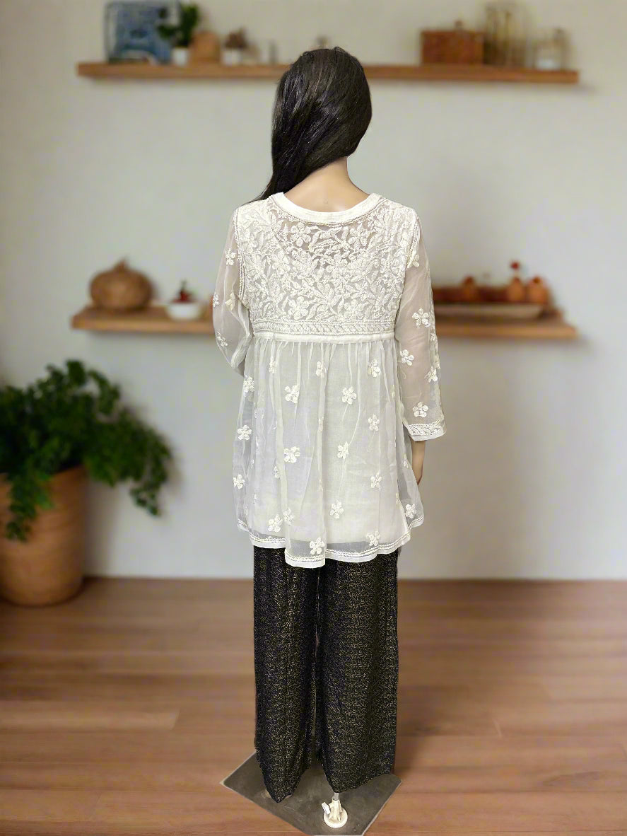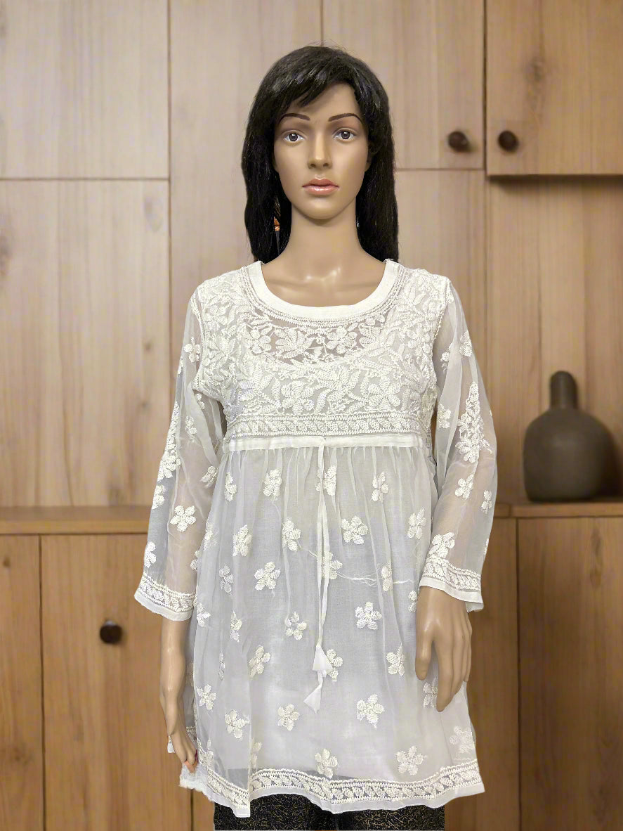 Lucknowi Chikankari White Georgette Short Kurti-T40012