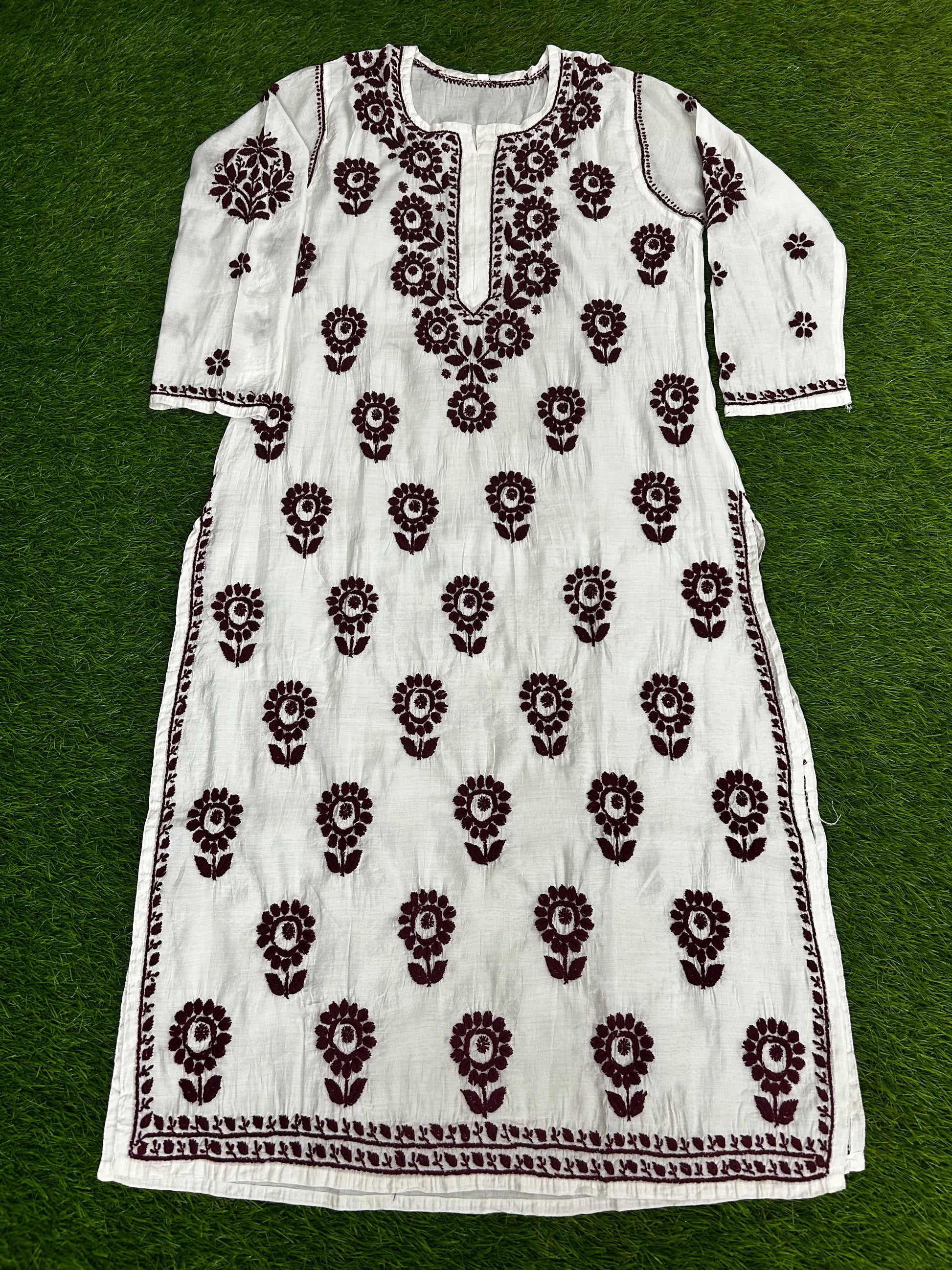 Disclaimer: This product is being processed using AI; Embroidery motifs and patterns in the image may differ from actual. Each kurti is uniquely hand-embroidered by artisans, and natural variations in motifs design are a hallmark of genuine work. Customers are assured of receiving an authentic handmade product, though it may not be an exact replica of visual. No rights are claimed over likeness of the model depicted in this AI-generated image.