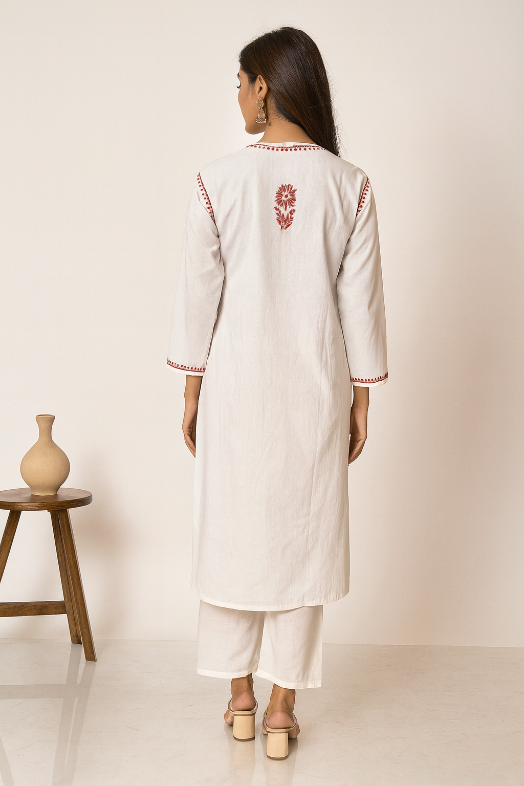 Crafted from a soft, soothing white fabric, this chikankari kurti offers exceptional comfort while beautifully showcasing traditional hand embroidery. Designed with quarter sleeves and a straight silhouette, it reflects timeless elegance suitable for both everyday wear and special occasions. The highlight of this kurti lies in its neckline and button patti, where multiple styles of chikankari embroidery are intricately combined, creating a rich, heavy necklace-inspired pattern. Vibrant red embroidery motifs are evenly placed across the kurti, lending it a soft, graceful, and bold appeal. The gentle contrast of red against white enhances its freshness.