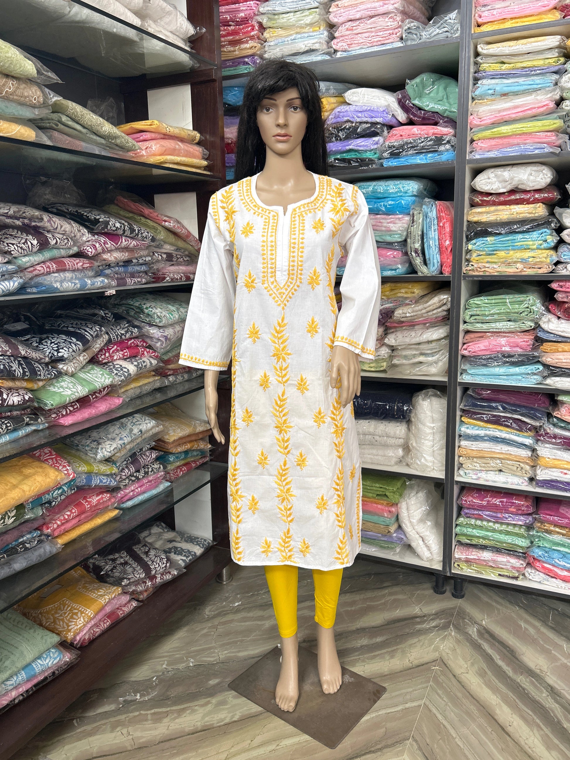Crafted from a soft, soothing white fabric, this chikankari kurti offers exceptional comfort while beautifully showcasing traditional hand embroidery. Designed with quarter sleeves and a straight silhouette, it reflects timeless elegance suitable for both everyday wear and special occasions. The highlight of this kurti lies in its neckline and button patti, where multiple styles of chikankari embroidery are intricately combined, creating a rich, heavy necklace-inspired pattern. Delicate yellow embroidery motifs are evenly placed across the kurti, lending it a soft, graceful, and sober appeal. The gentle contrast of yellow against white enhances its freshness.