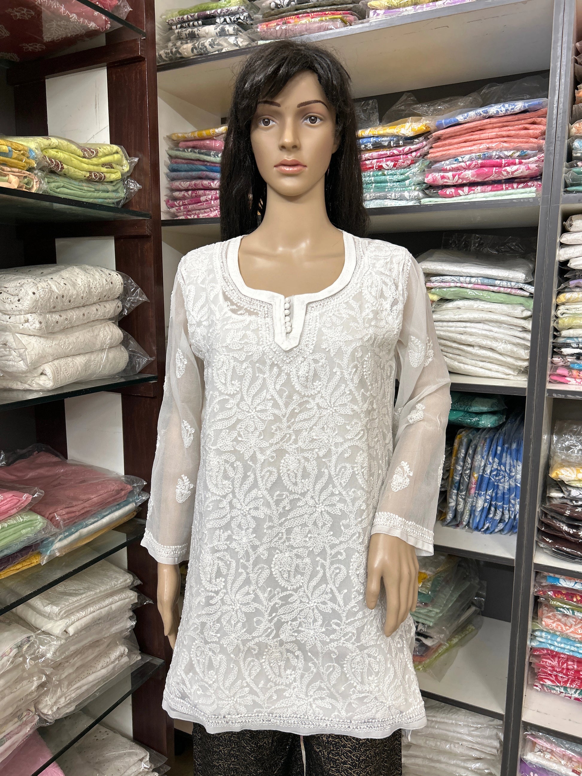 This Lucknowi Chikankari white georgette short kurti showcases exquisite hand-embroidered craftsmanship, blending traditional artistry. A typical 'White-on White' chikankari article. Its lightweight design ensures comfort in warm climates, while the intricate chikankari patterns add timeless elegance, making it an ideal choice for both casual and semi-formal occasions.