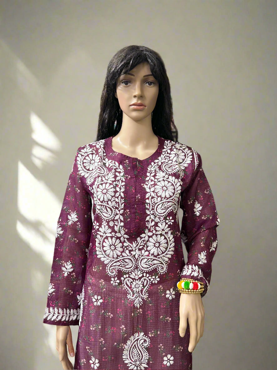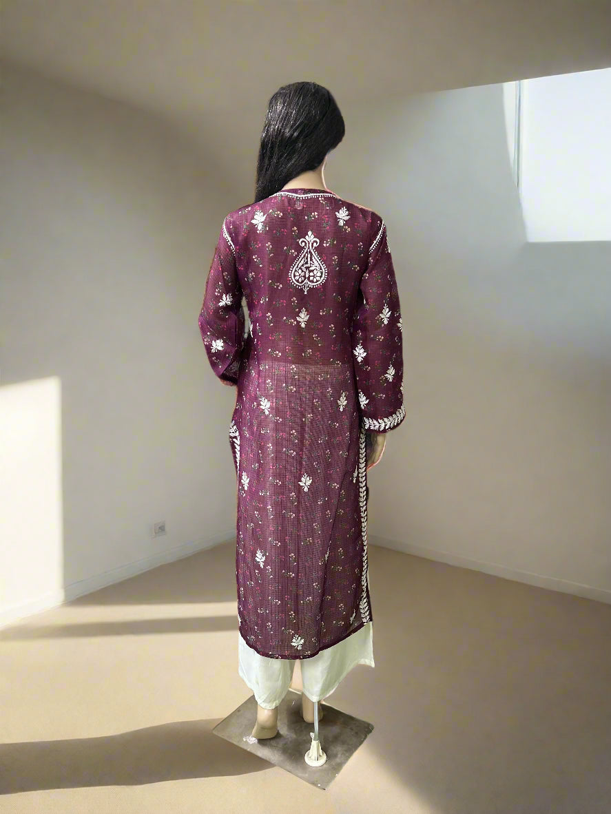 Lucknowi Chikankari Wine 'Jamuni' Printed Faux Kota Kurti-K40091