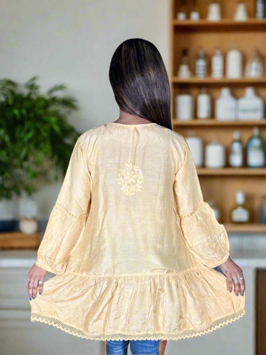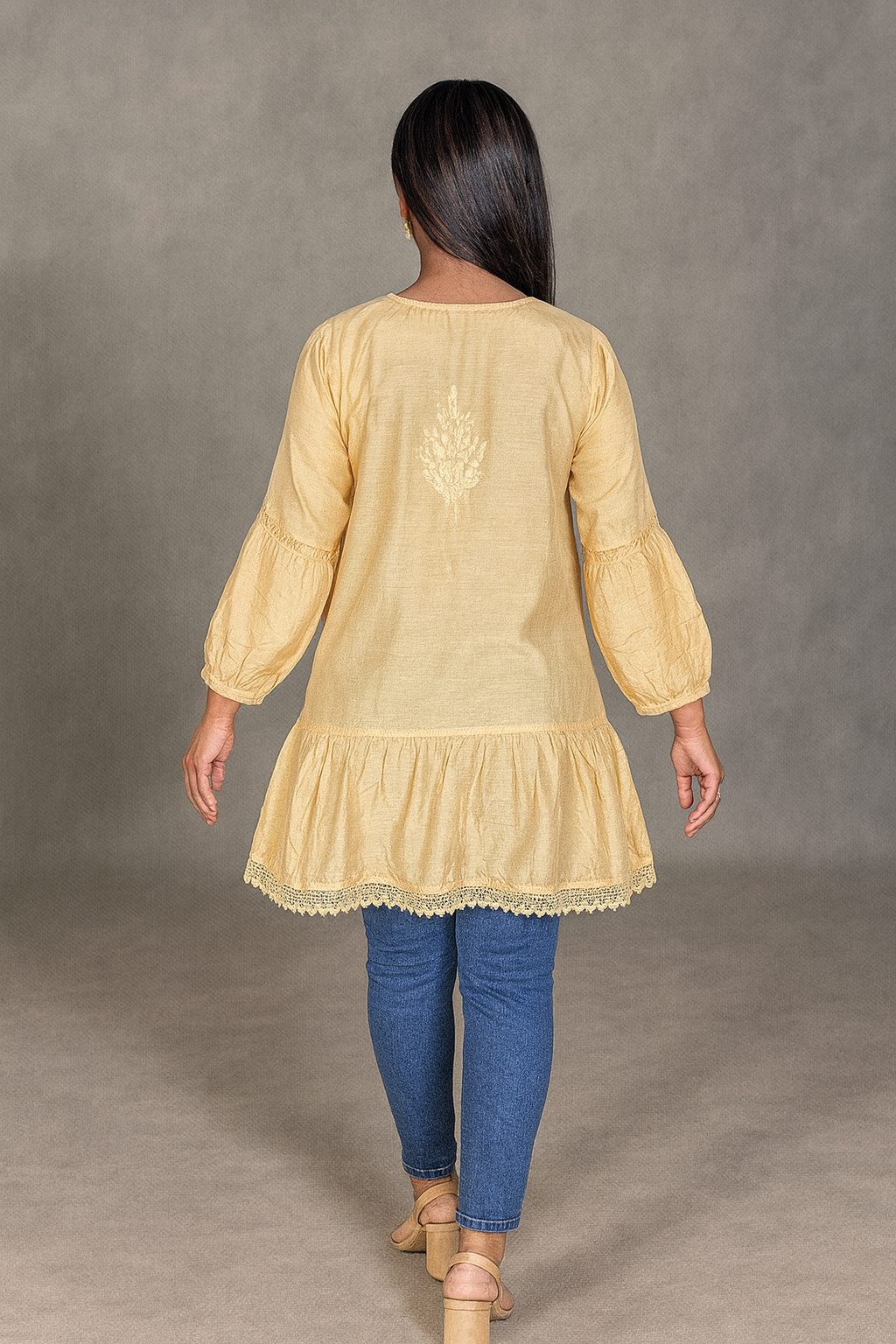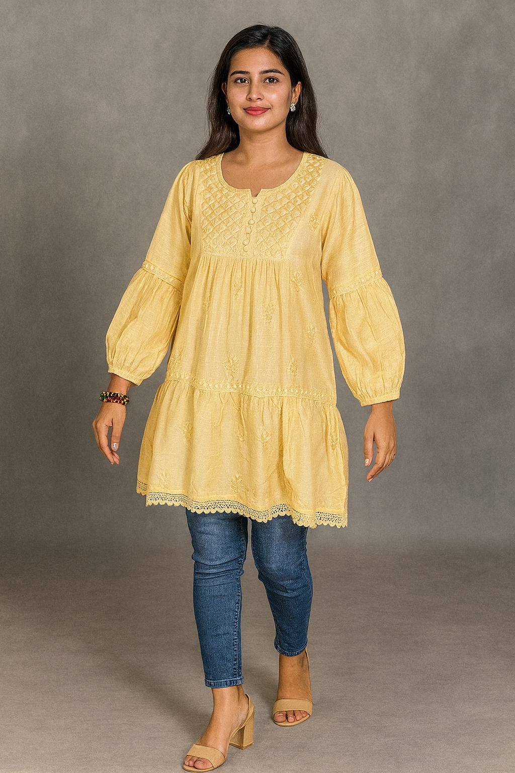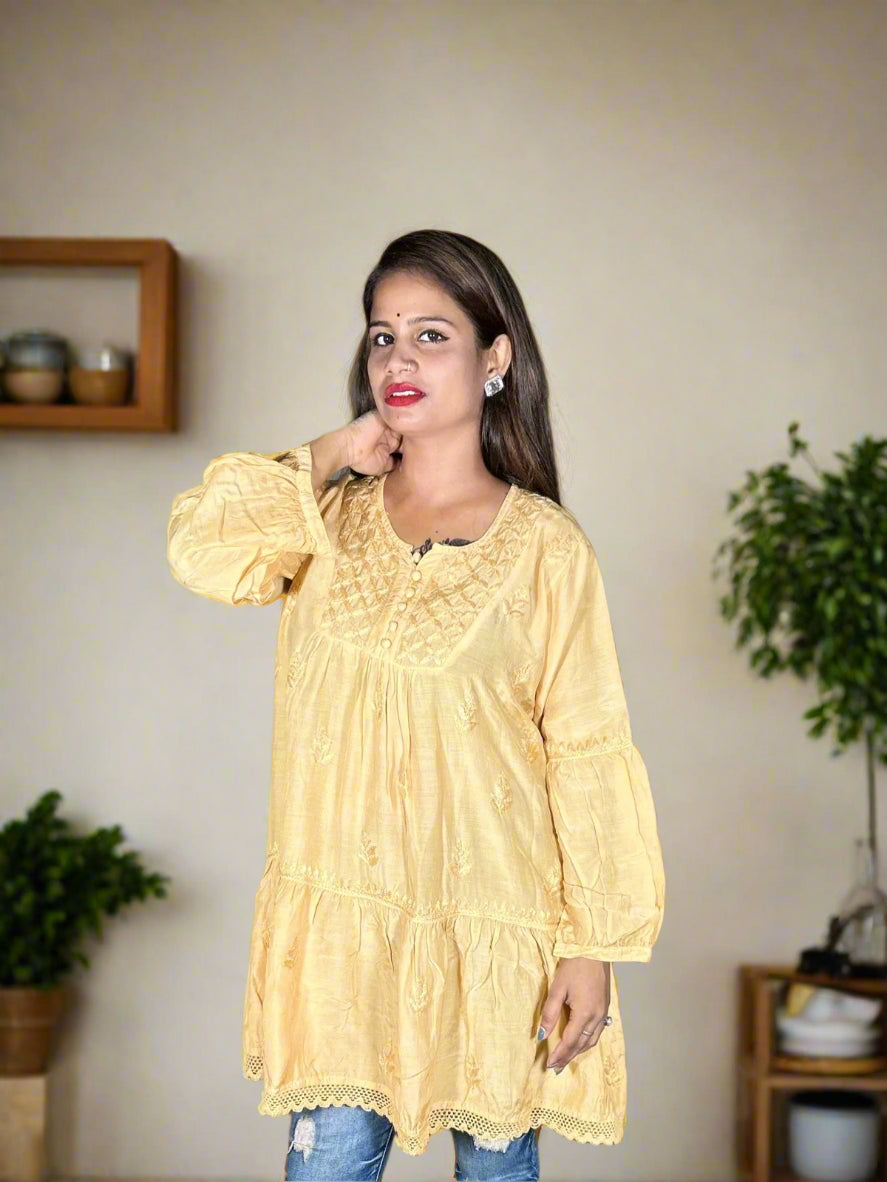 Lucknowi Chikankari Yellow Muslin Short Kurti-T40007