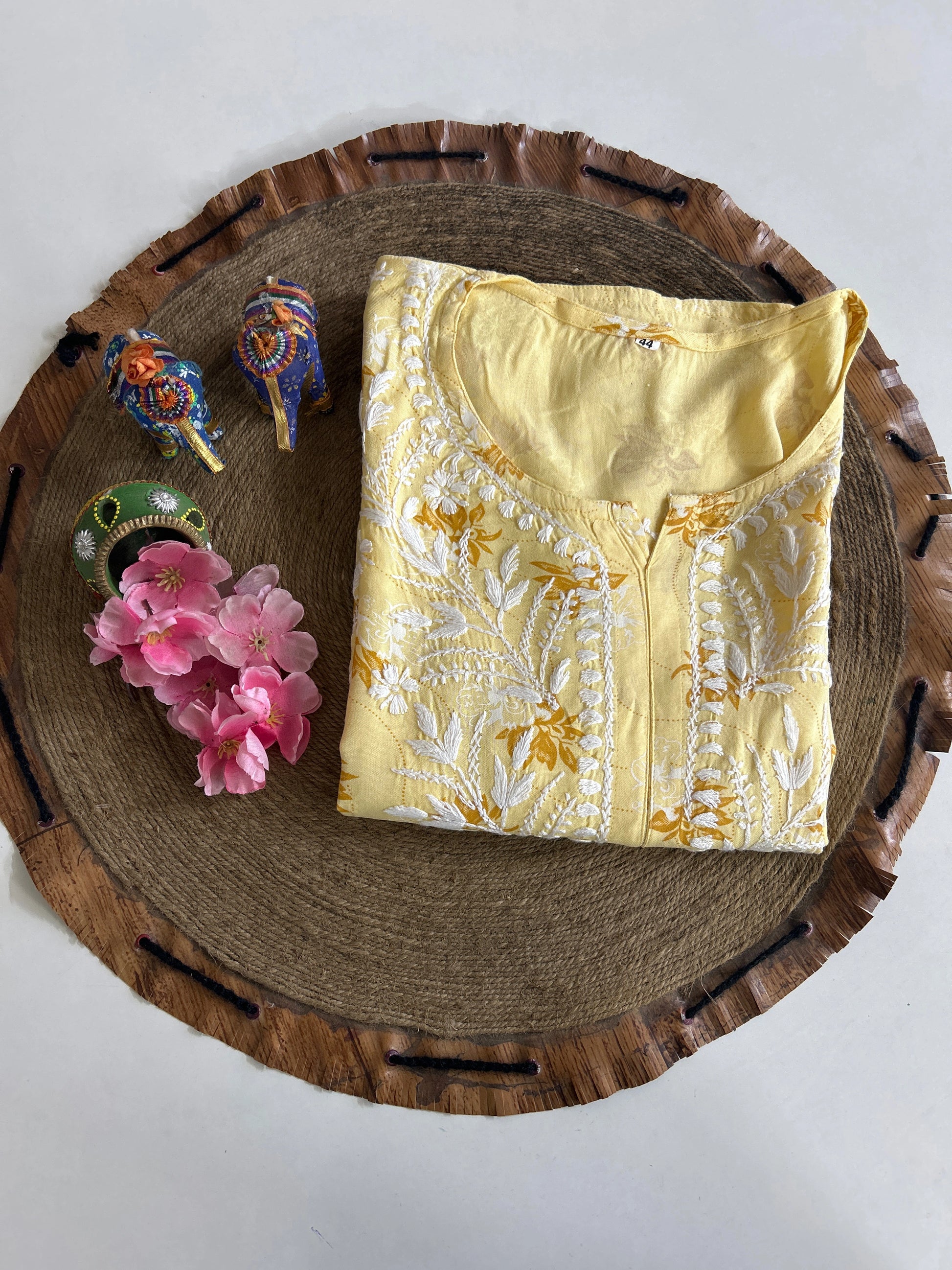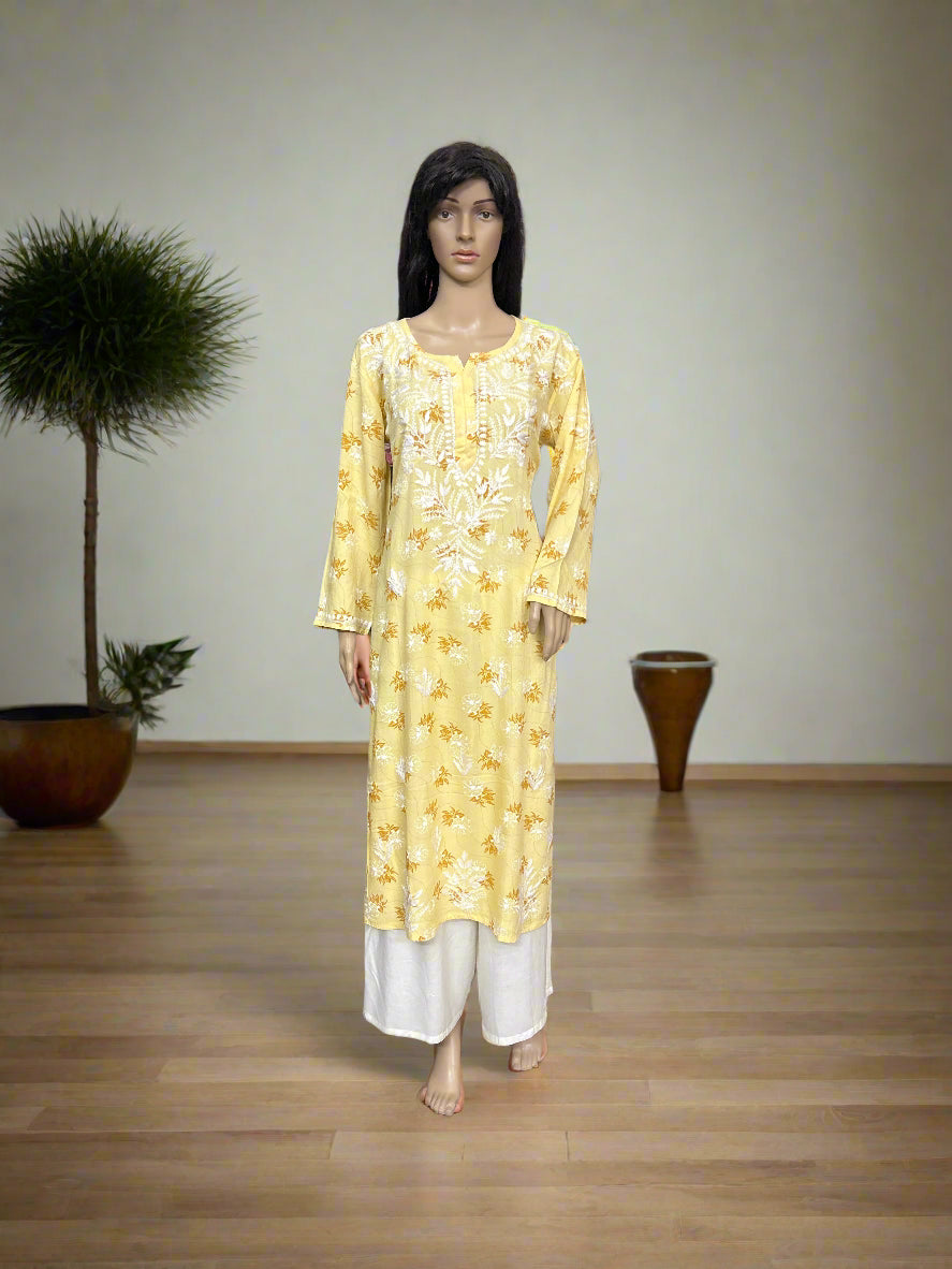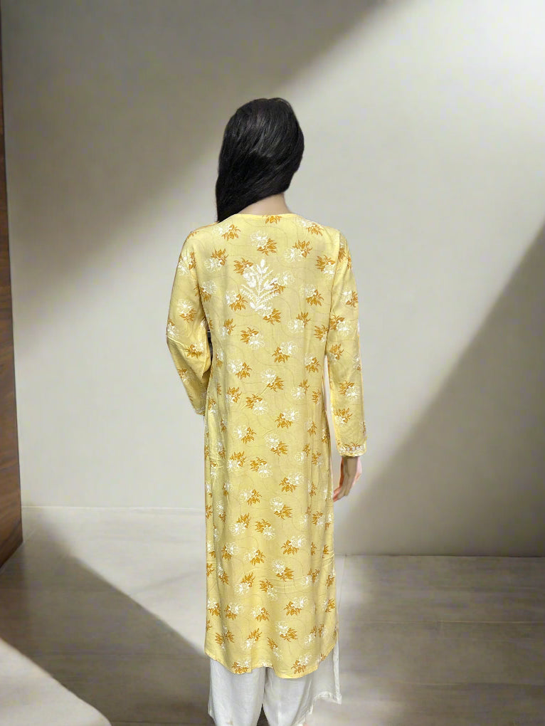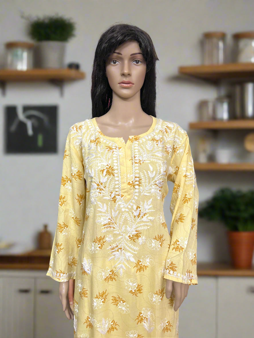 Lucknowi Chikankari Yellow Printed Rayon Kurti-K000076