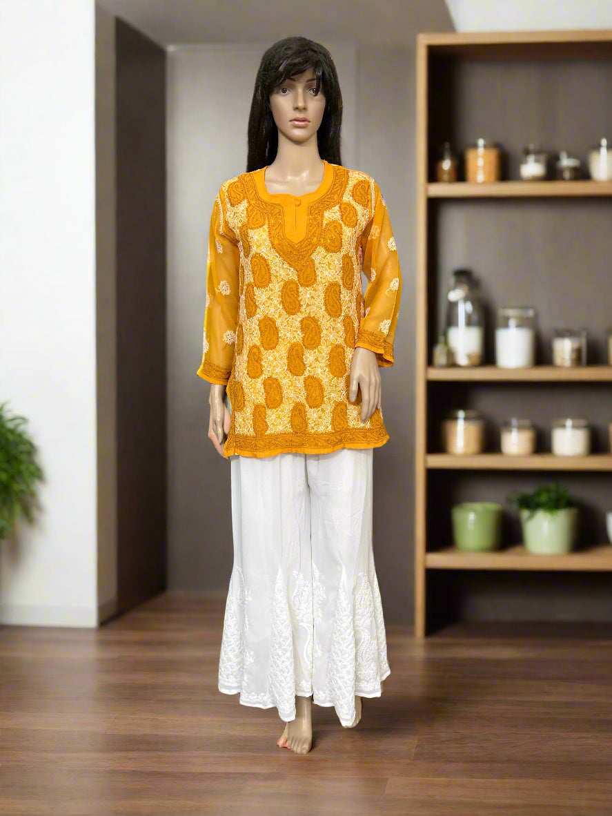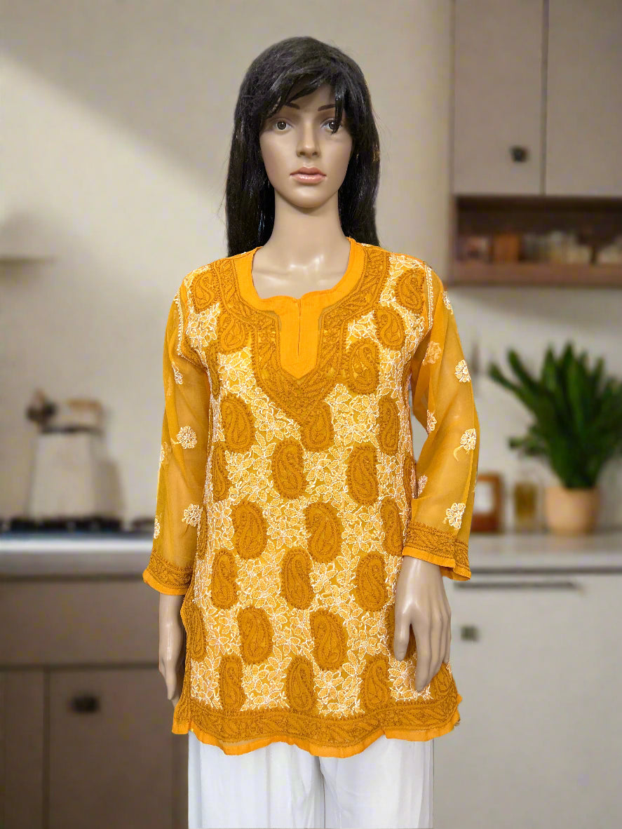 Lucknowi Chikankari Yellow 'Sunehri' Georgette Short Kurti-T30021