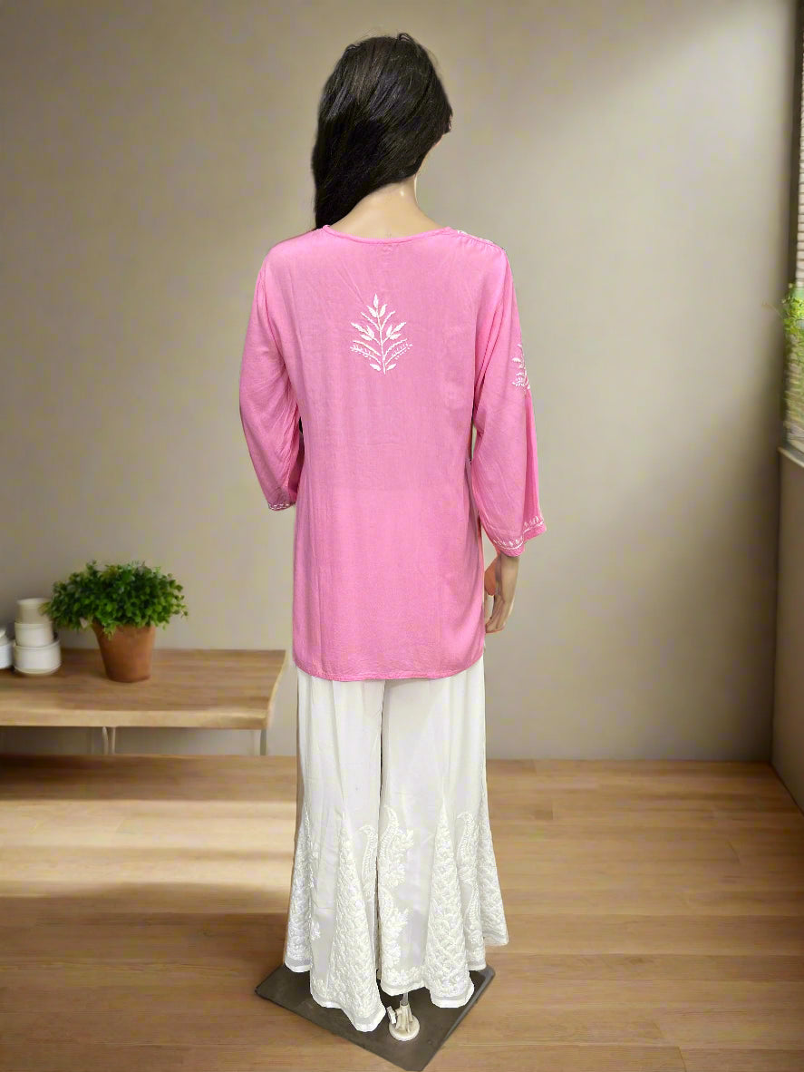 Lucknowi Chikankari Pink Rayon Short Kurti-T000067