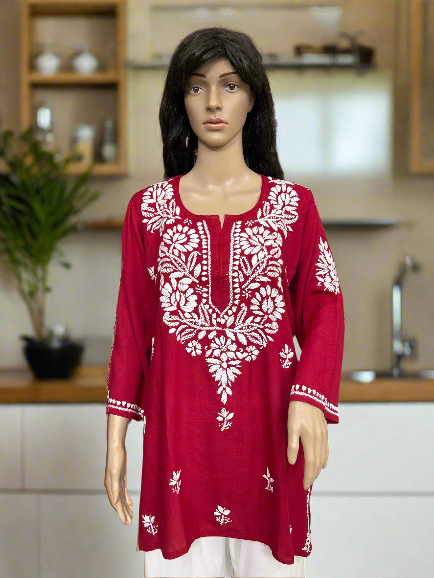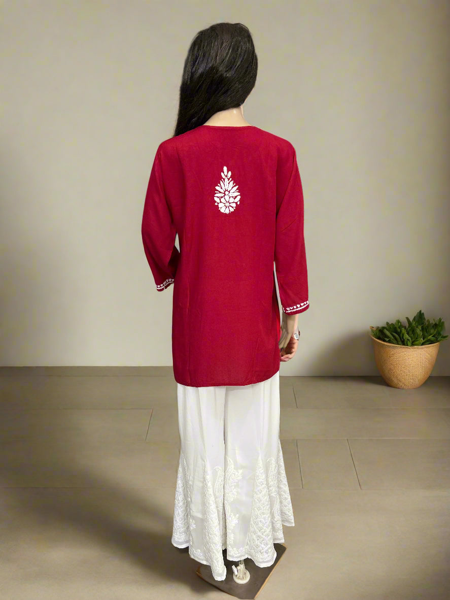 Lucknowi Chikankari Red Rayon Short Kurti-T000064